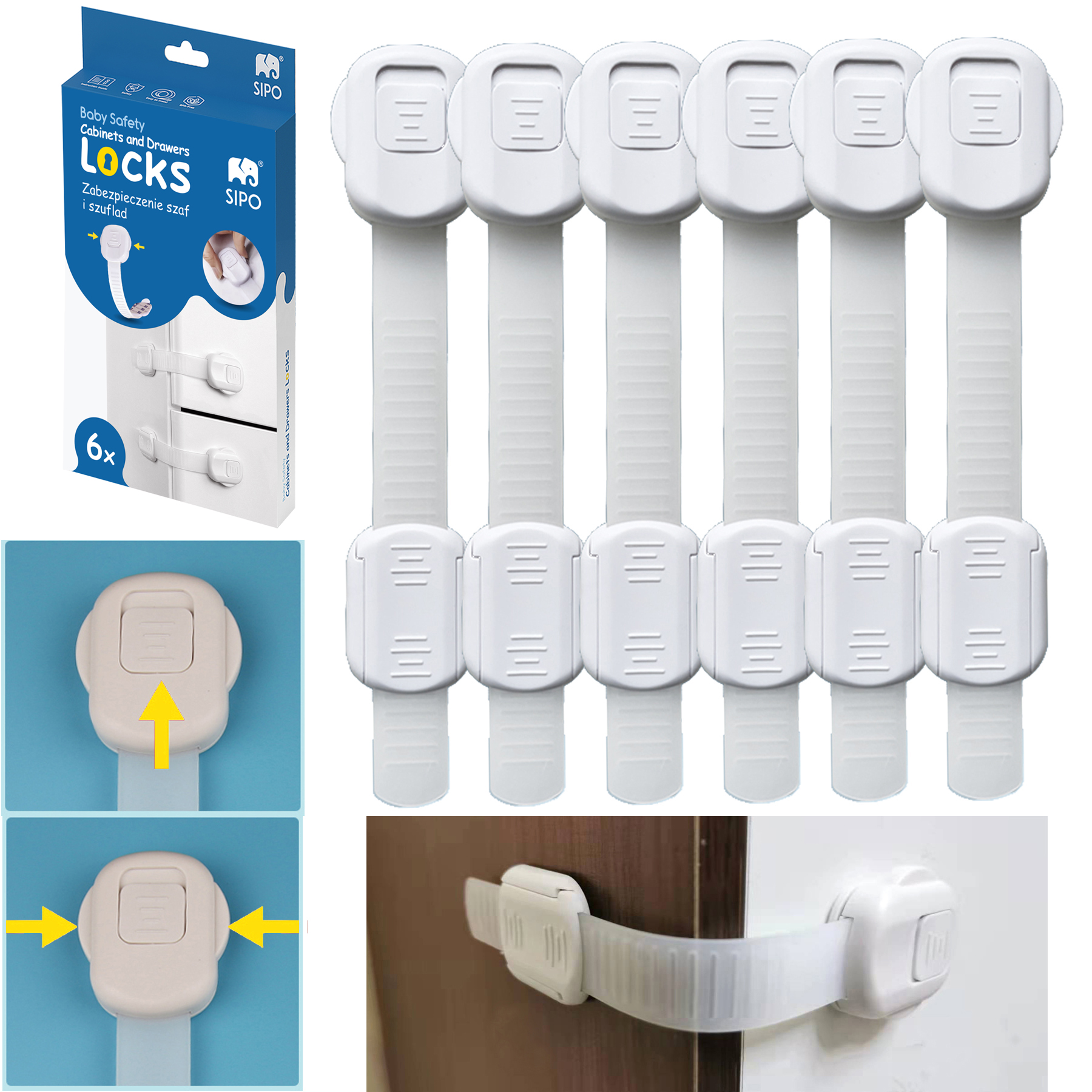 SIPO 6-piece Cabinet lock set with adjustable locks for cabinets, featuring a simple locking function that ensures quick access for adults but protects against opening by toddlers. The locks have a length adjustment option. This is a practical and simple solution that ensures your child’s safety by preventing access to dangerous items or substances stored in cabinets and drawers.