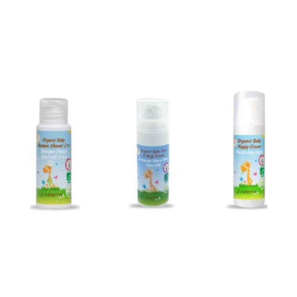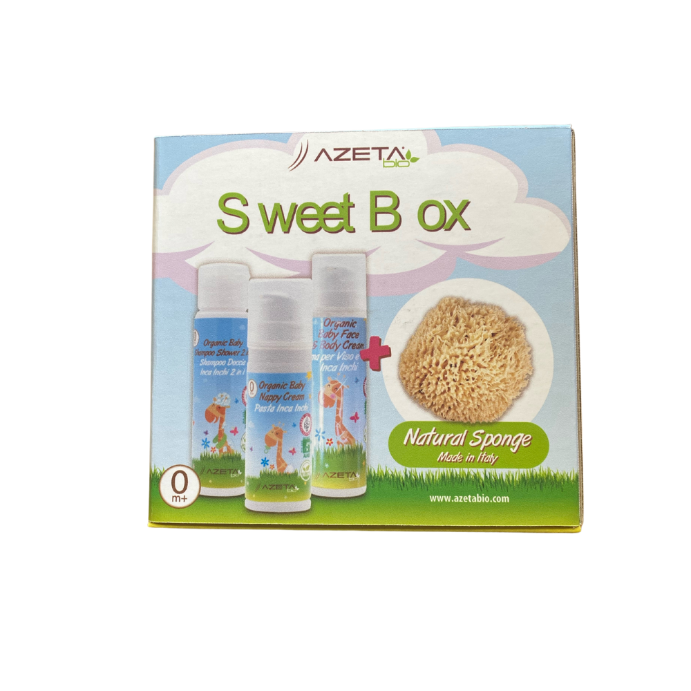 AZETABIO gift set, which includes organic nurturing baby cream with Aloe Vera and Sacha Inchi oil, AZETABIO organic nurturing body and hair wash for babies with Aloe Vera and Sacha Inchi oil, natural nurturing and protective diaper cream with Aloe Vera, plus a complimentary natural children’s bath sponge. This is an ideal gift idea for a child’s birthday or Christmas.