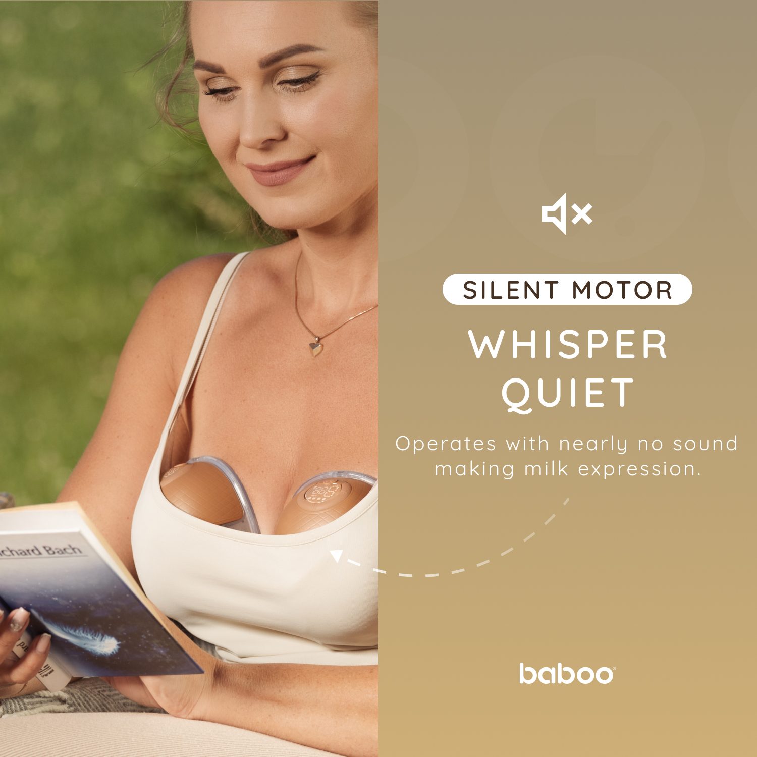 • Use the baboo® electric hands-free pump quietly and discreetly thanks to our whisper-quiet breast pump with noise levels as low as 50 dB. Designed for silent operation, it is ideal for public spaces or at work without drawing attention.