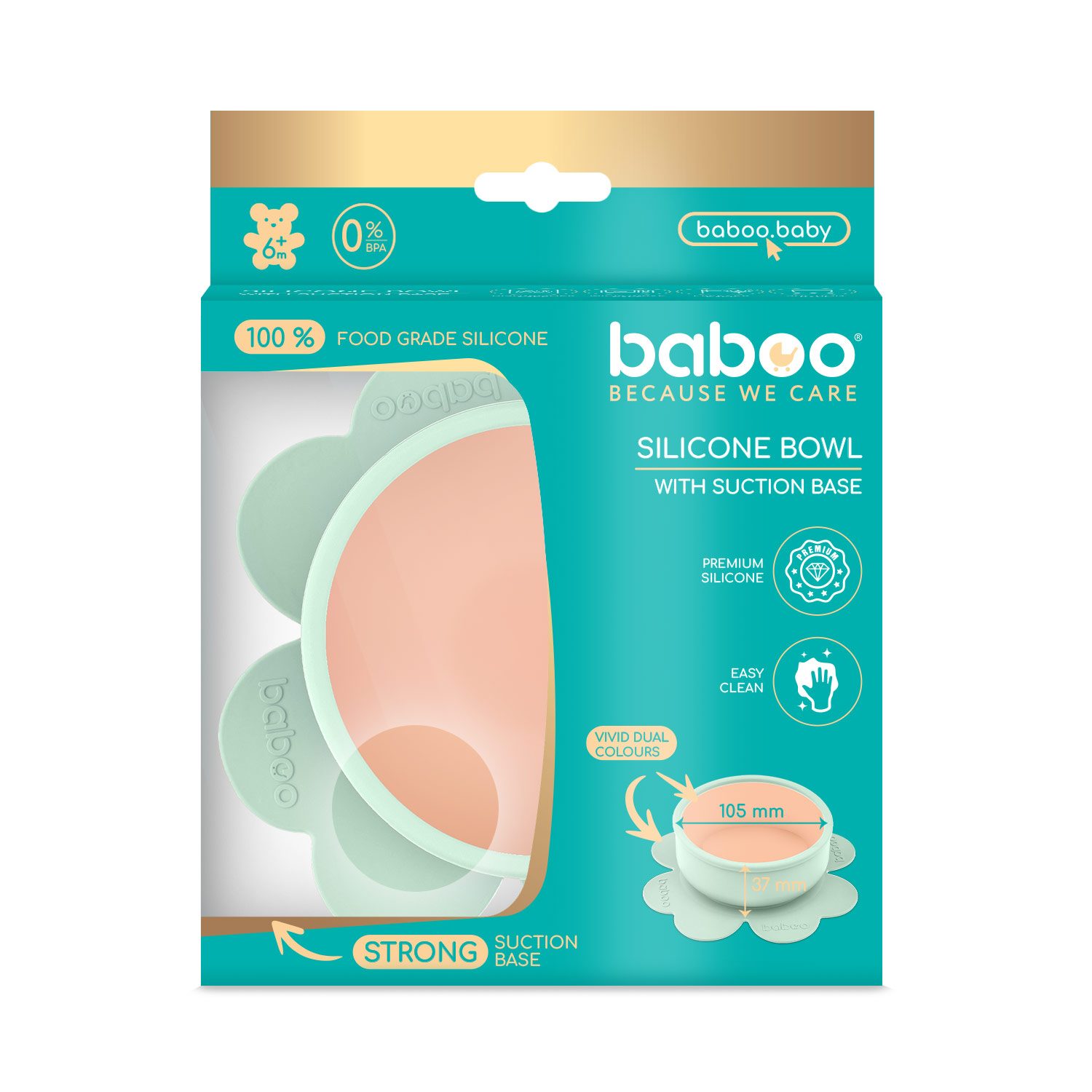 The Baboo silicone bowl with a sticky base for smooth surfaces is useful for cleanliness-loving parents and children, helping develop their independent eating skills.