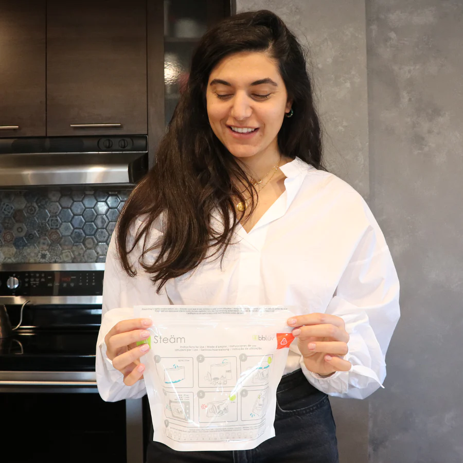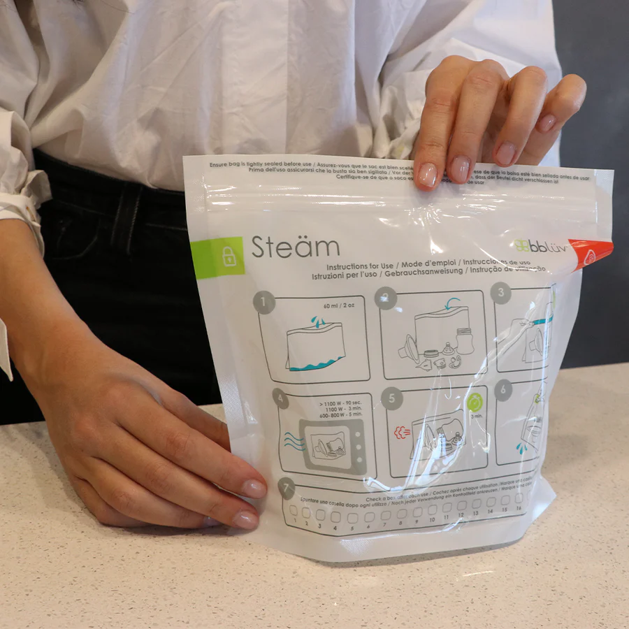 Steam makes all your sterilization needs simple, quick, and convenient. Whether you need to sterilize your bottles, nipple shields, pacifiers, breast pump parts, or other bblüv product components, our microwave quick steam sterilization bags efficiently remove bacteria and germs in just a few minutes! Each of the included 6 bags can be reused up to 20 times for a total of 120 sterilization cycles. Easy to follow instructions are printed on each bag. With Steam, it’s easy to make everything clean and safe for you and your baby, no matter where you are.