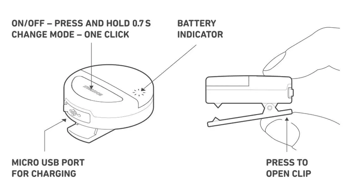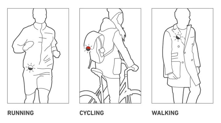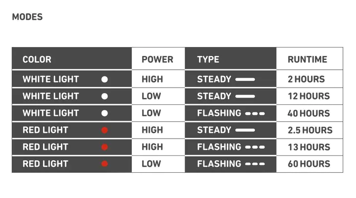 The lamp features different modes that provide varying burn durations (see images). Attach the reflector to clothing, handbag, or any place with a fastening possibility with just one click. You can also wear the reflector during various active activities like running, cycling, walking, etc.