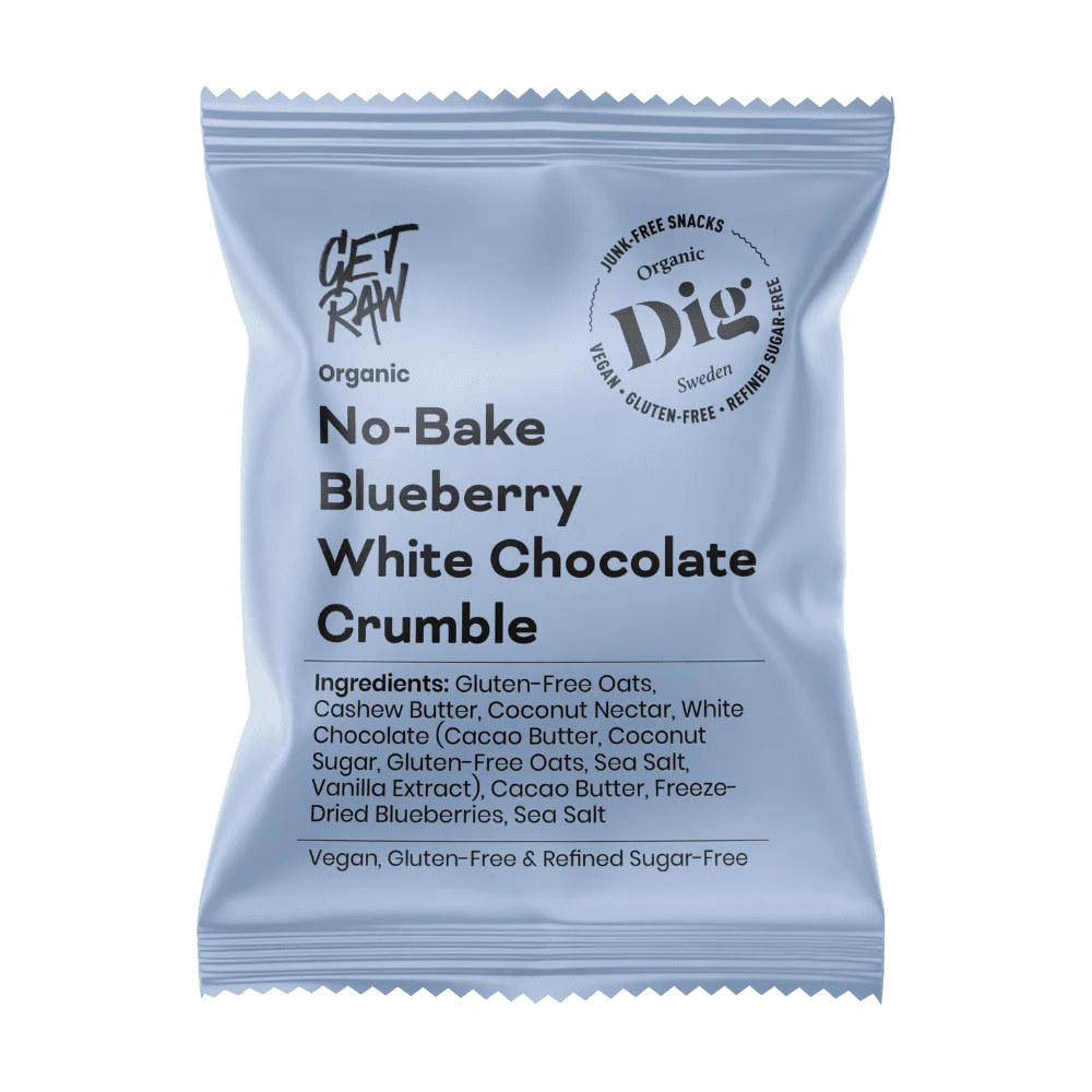 Gluten-free oats, cashew butter, coconut nectar, white chocolate 6% (cocoa butter, coconut sugar, gluten-free oats, sea salt, vanilla extract, cocoa content 40%), cocoa butter, freeze-dried blueberries 4%, sea salt. Organic.