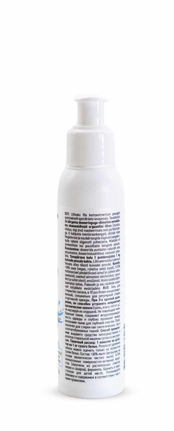 - Fragrance-free regular detergent gel for sportswear, capable of removing unpleasant odors (dirt, moisture, sweat, urine) with a dosing three times higher than the normal amount. A special and unique detergent gel recipe developed in Estonia, which is capable of removing organic odors at a molecular level without the need to mask them with other fragrances.