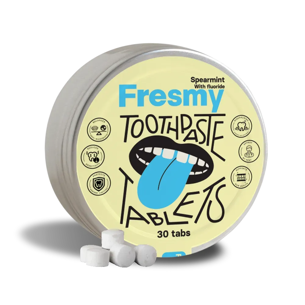 Spearmint toothpaste tablets contain hydroxyapatite (HAp), a non-toxic alternative to fluoride. It naturally restores tooth enamel. Additionally, they contain fluoride (at precisely 1450 ppm) in case you definitely need this ingredient in your product.