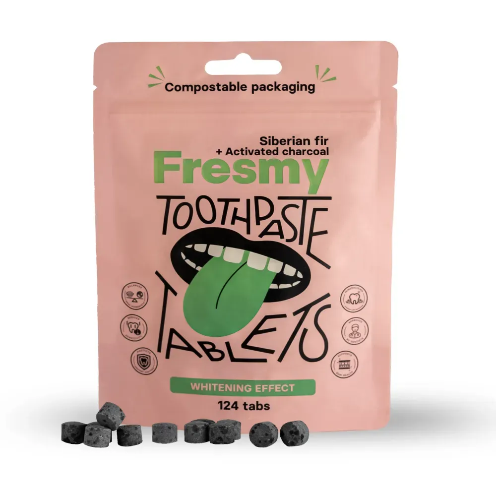 Siberian fir and activated charcoal toothpaste tablets contain hydroxyapatite (HAp), which is a non-toxic alternative to fluoride. It naturally restores tooth enamel.