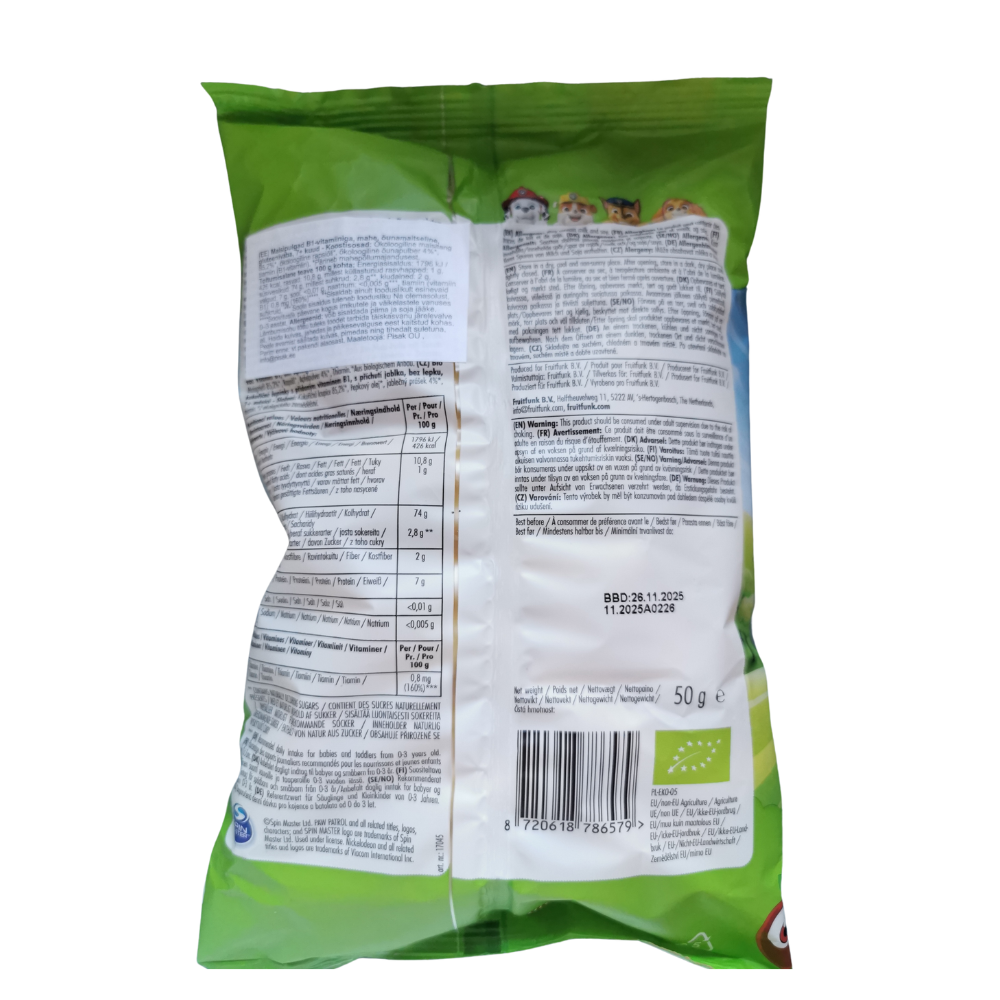 Ingredients: date paste, apple paste (concentrated apple juice, concentrated apple purée, gelling agent: fruit pectin, antioxidant: ascorbic acid), lemon concentrate, strawberry powder 1%, natural flavorings. Nutritional value per 100 g: Energy: 1253 kJ/298 kcal, fats: 0.5 g, of which saturated fatty acids: <0.1 g, carbohydrates: 69 g, of which sugars: 63 g*, fiber 6.9 g, proteins: 1.8 g, salt: 0.1 g. *Only natural sugar contained in fruits. Allergens: May contain traces of cereals containing gluten, soy, and milk, nuts and peanuts. May contain fragments of fruit stones.