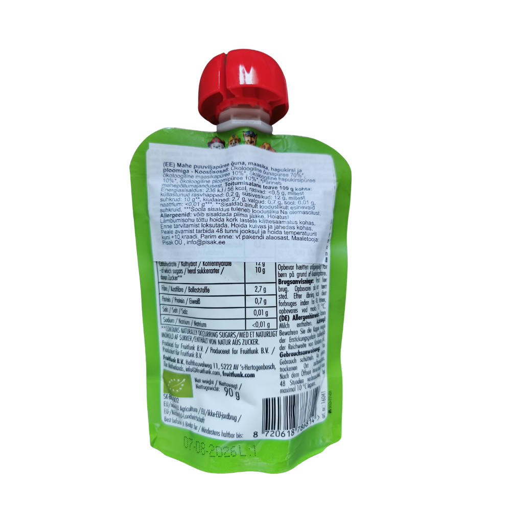 BANANA BITE: fruits 183 g* (concentrated pear puree 77 g*, concentrated apple juice 69 g*, banana puree 37 g*), citrus fiber, gelling agent: fruit pectin, natural flavors. *g used for 100 g of finished product. Nutritional value per 100 g: Energy: 1355 kJ/320 kcal, fat: 1.1 g, of which saturated fatty acids: 0.2 g, carbohydrates: 74.9 g, of which sugars: 62.8 g*, fiber: 6.8 g, protein: 1.8 g, salt: 0.1 g. *Only natural sugar contained in fruits.