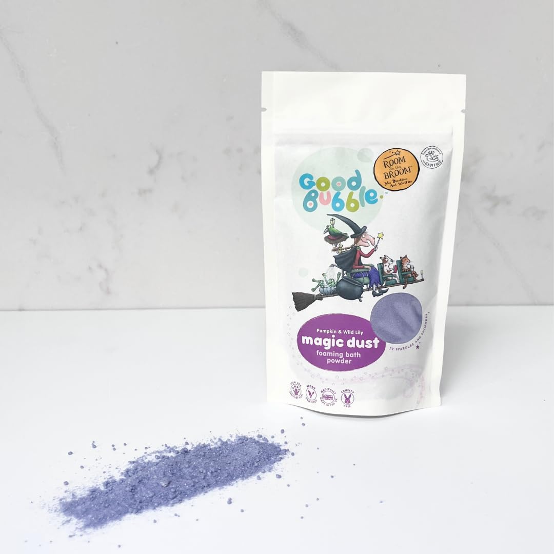 Take flight in the bath and prepare your potion with our Room on the Broom pumpkin and wild lily bubbling bath dust. Sprinkle the dust into running water and watch it transform into a bubbling purple mixture.