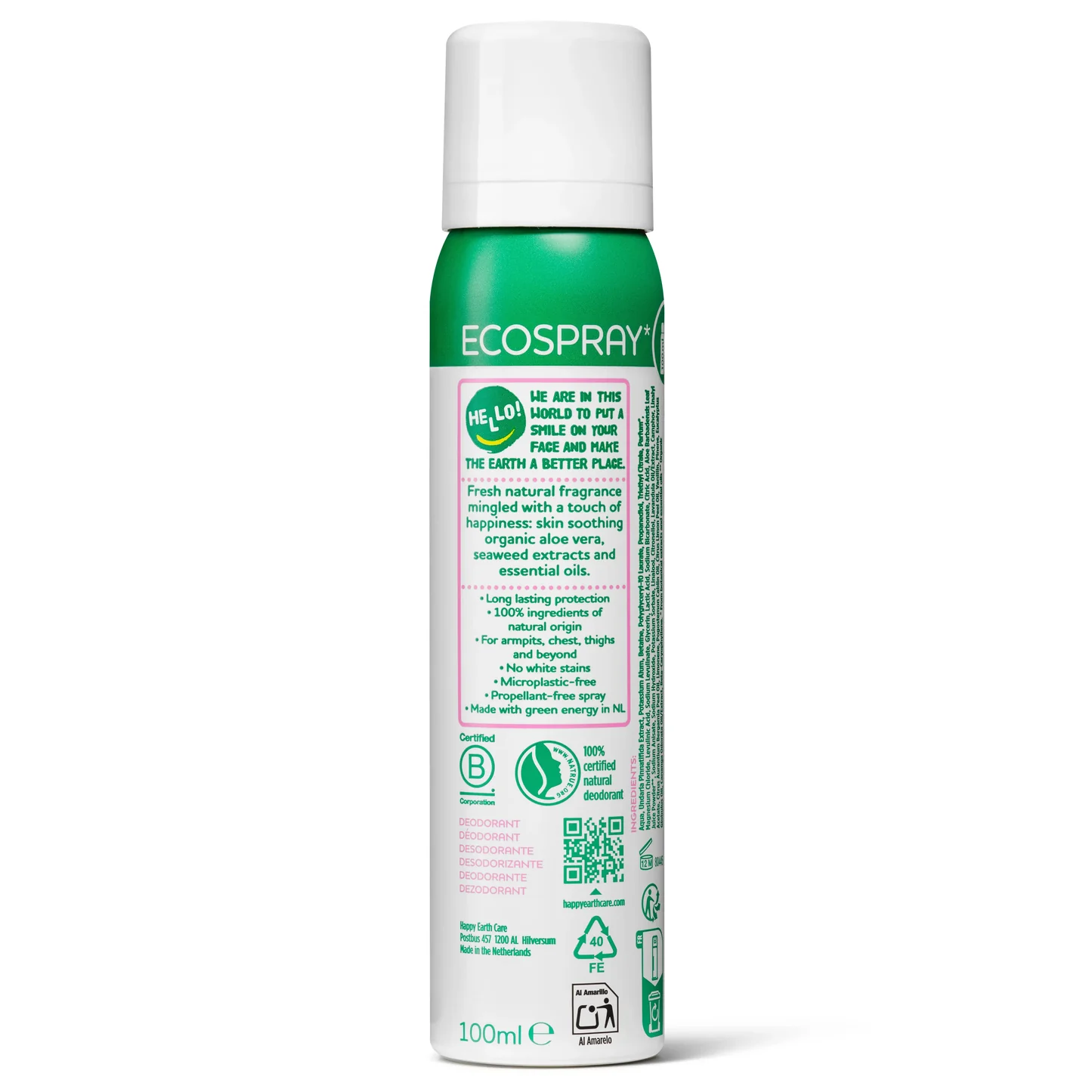Happy Earth Whole Body Deo Spray Lavender Ylang is a 100% natural vegan body deodorant designed to refresh the entire body – from underarms to legs and torso area. The deodorant contains no aluminum chloride, alcohol, parabens, mineral oils, or harmful gases, and is completely microplastic-free.
