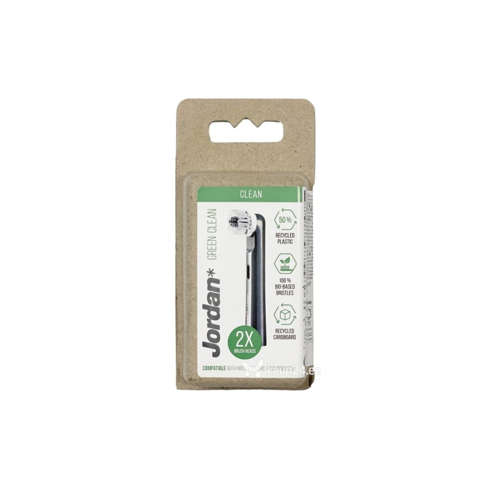 Jordan Green Clean electric toothbrush replacement heads ensure effective and gentle cleaning. The brush heads are made from 50% recycled plastic, and the bristles are made from 100% bio-based nylon derived from castor oil, a renewable resource. The packaging is made from 100% recycled paper fibers. 2 pcs. Jordan Green Clean brush heads. Can be used with both Jordan Clean Smile Electric toothbrushes and all Oral-B electric toothbrushes (except iO and Pulsonic).