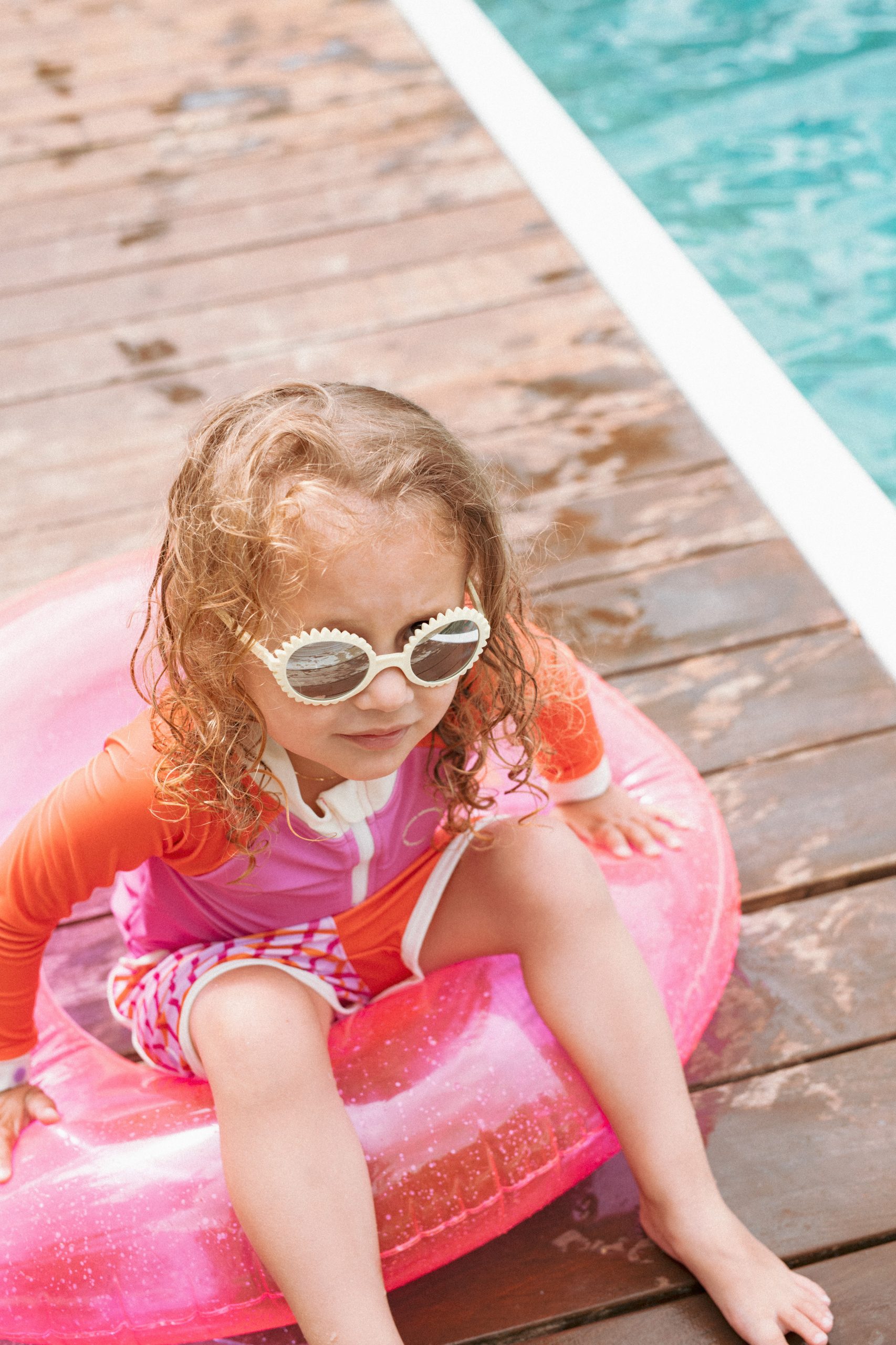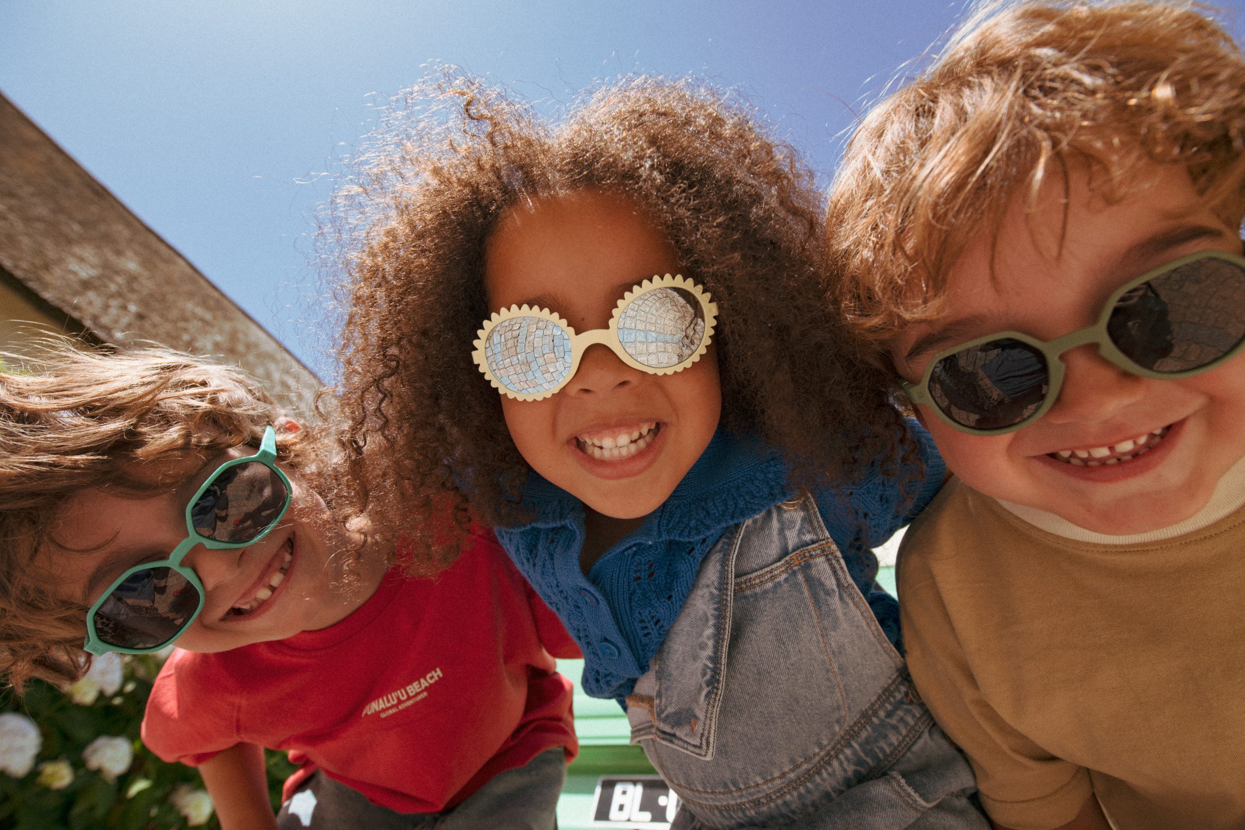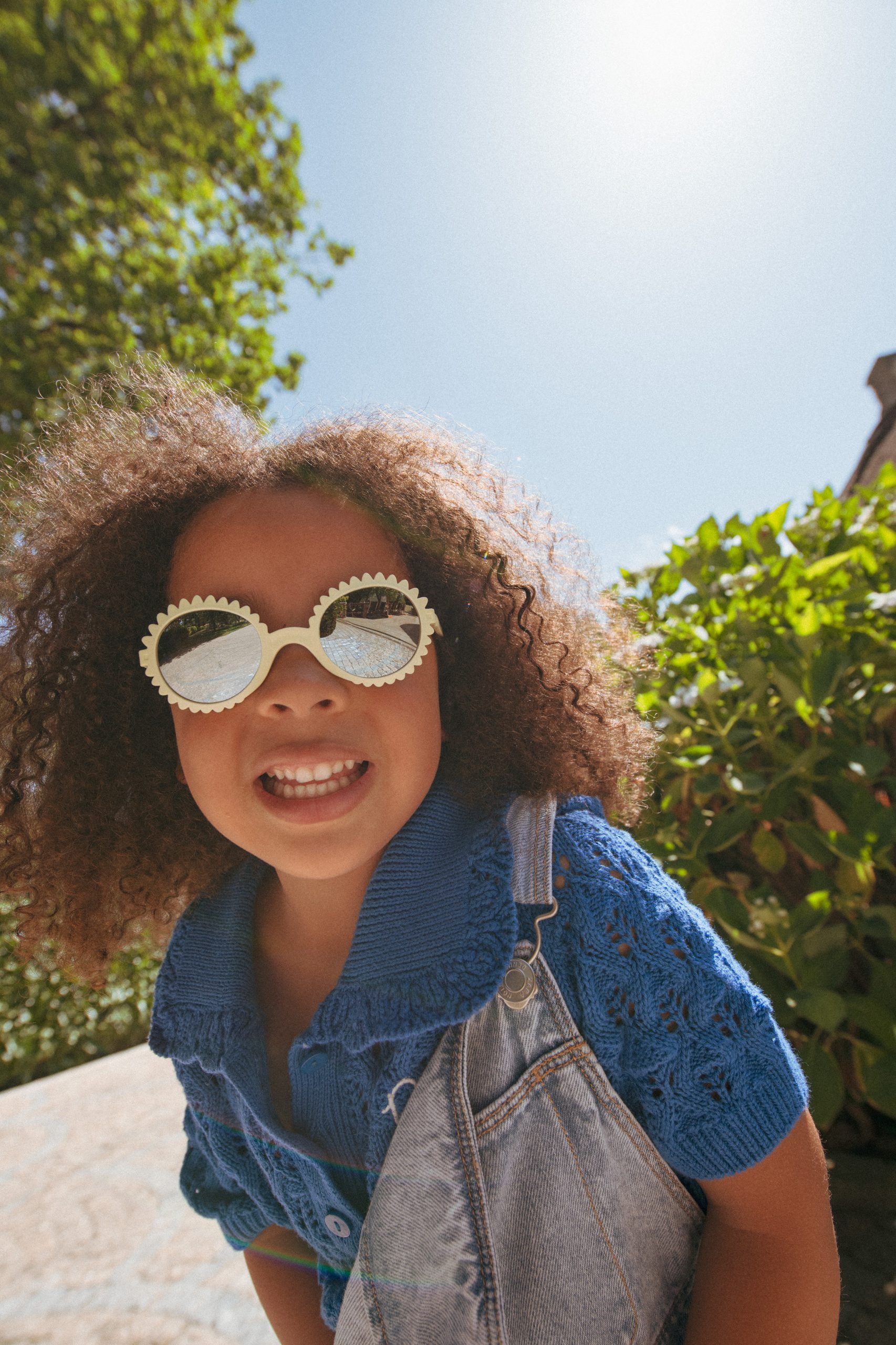 Ultra-lightweight Fleur sunglasses have a round pantos-shape, frames with flower petals, and are equipped with mirror lenses (made of polycarbonate). The glasses are 100% made in France and suitable for children aged 0-4 years (0-1, 1-2, 2-4 years). Available in various colors.