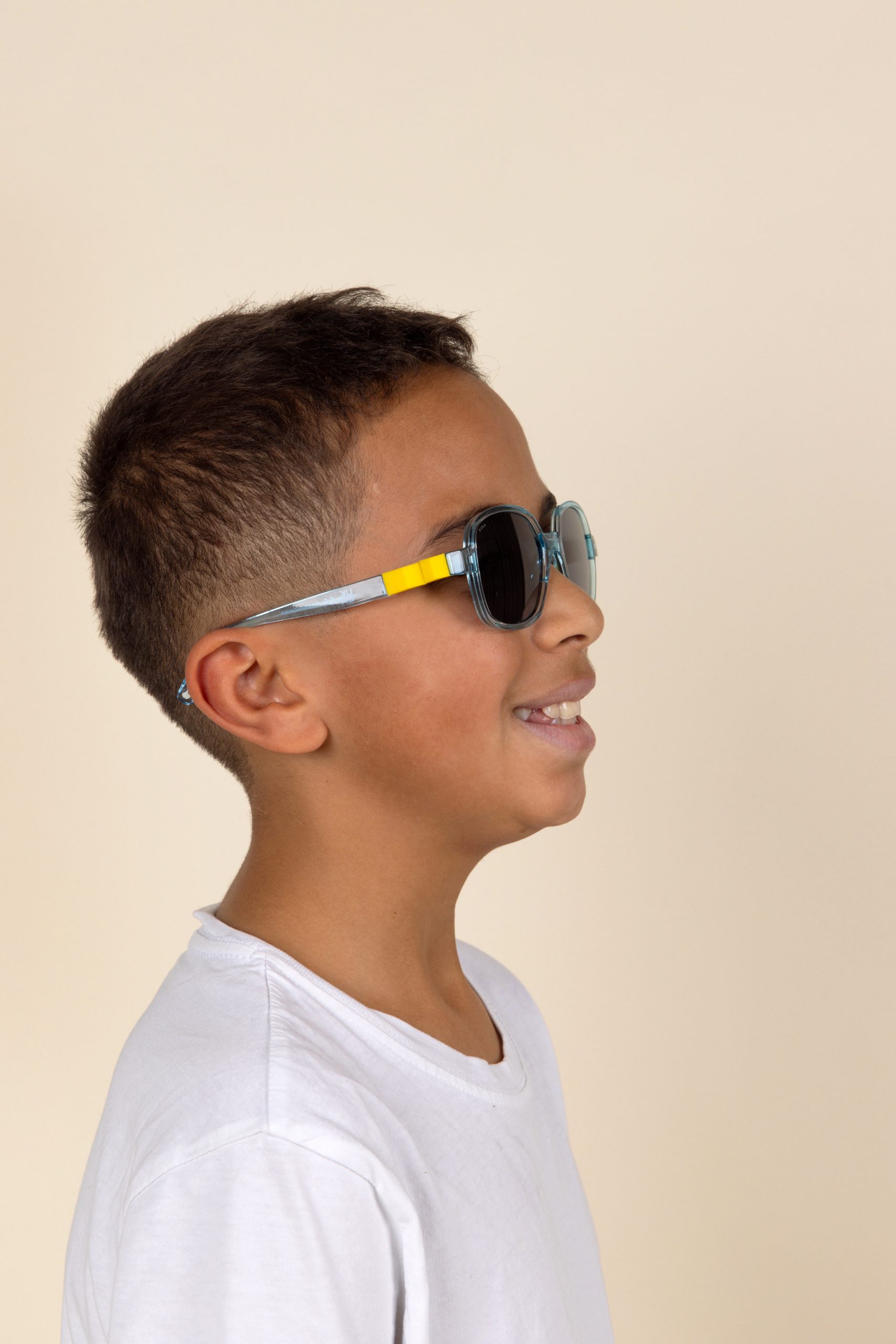 The semi-thick temples of the glasses are made of translucent material and feature a 180° flexible hinge, allowing them to open wide without damaging the frame. A consistent matte tone adds character, while the translucent tone keeps the design light. The model is available in two sizes: 4–7 and 7–12 years, fitting different face shapes.