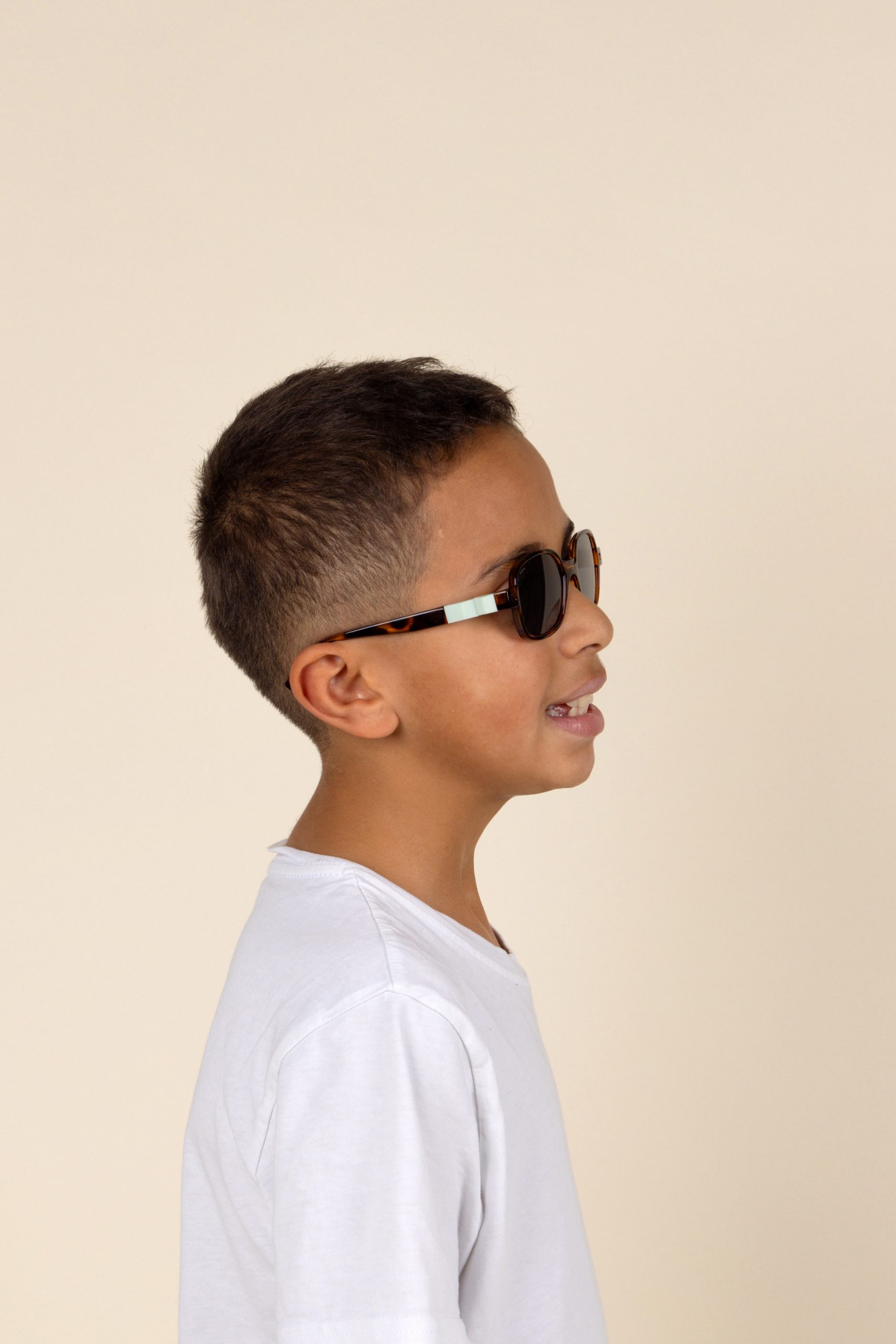 The semi-thick temples of the glasses are made of translucent material and with a 180° flexible hinge, allowing wide opening without damaging the frame. The uniform matte tone adds character while the translucent tone keeps the design light. The model is available in two sizes: 4–7 and 7–12 years, fitting different face shapes.