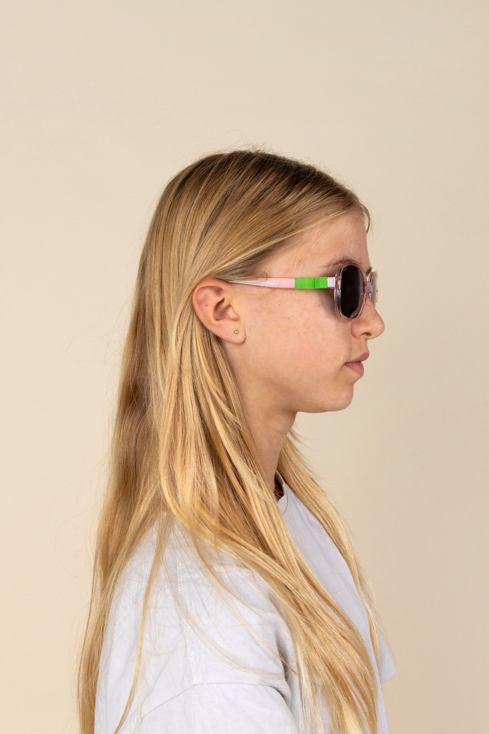 The semi-thick arms of the glasses are made from a translucent material and feature a 180° flexible hinge, allowing a wide opening without damaging the frame. The uniform matte tone adds character, while the translucent tone keeps the design lightweight. The model is available in two sizes: 4-7 and 7-12 years, fitting different face shapes.