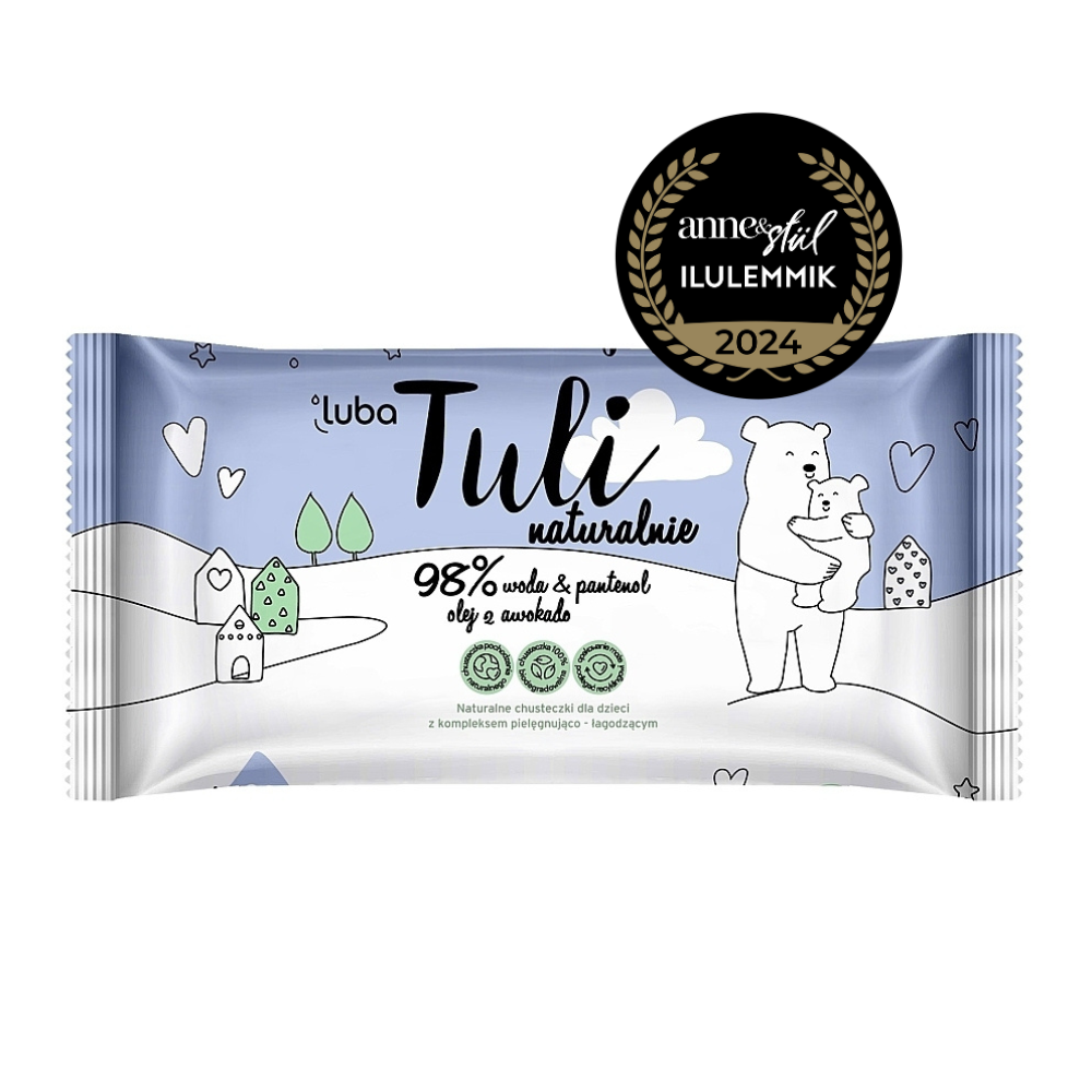 Gentle, natural Luba Tuli wet wipes with a caring and soothing complex based on 98% water, panthenol, and avocado oil. For caring, cleaning, and refreshing babies’ skin from the first month of life.