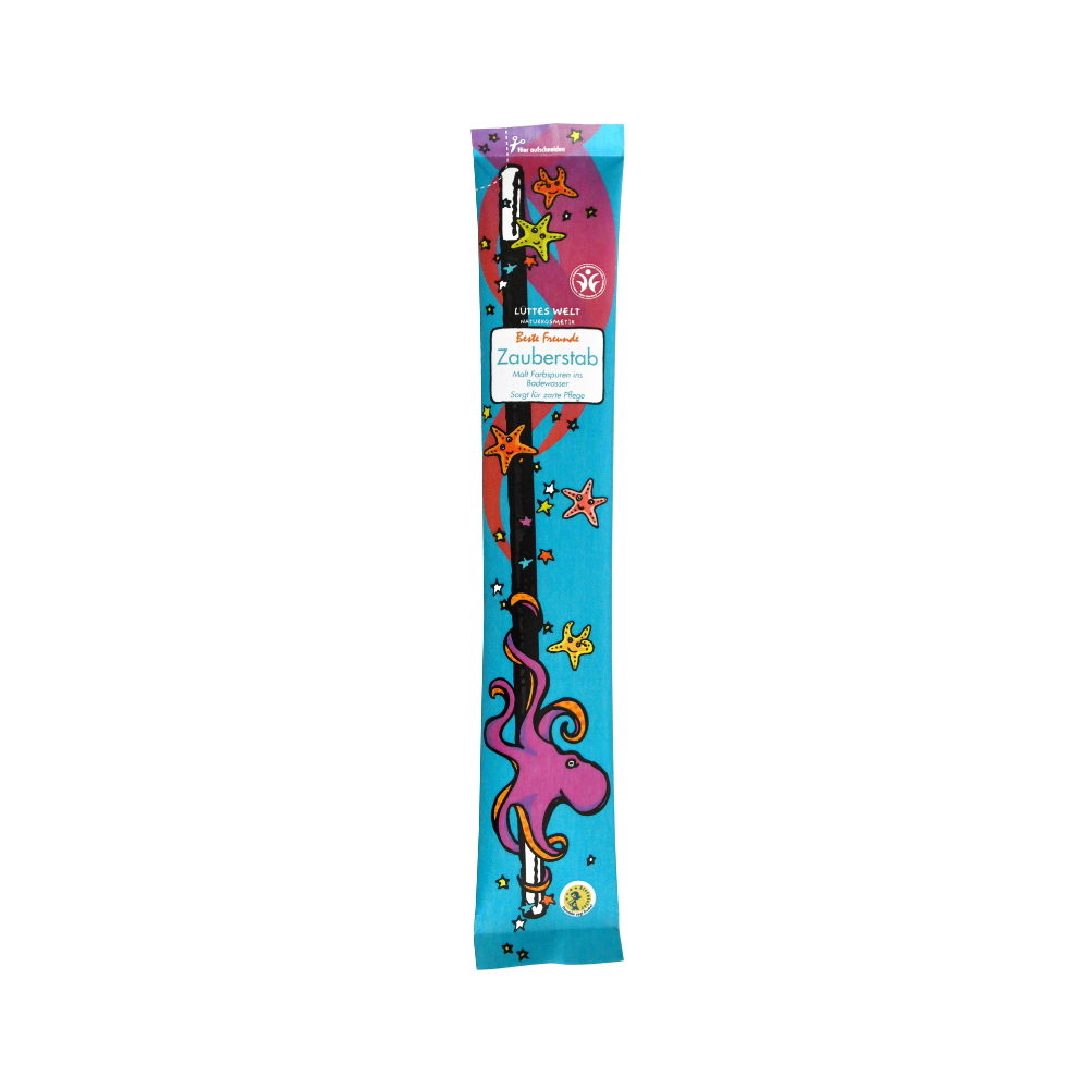 Fill the bath with water at a temperature suitable for your age. Open the magic wand at the designated spot. Now, with the bag in hand, your child can enchant the bathwater with colorful streaks and turn the bath into a purple lagoon.