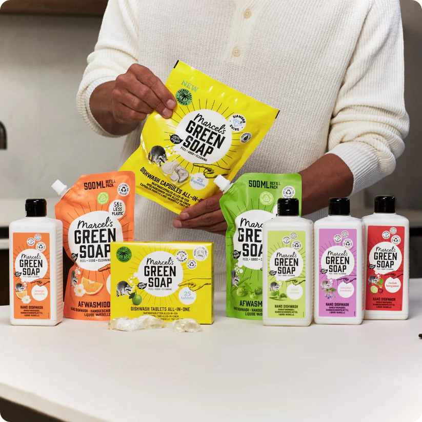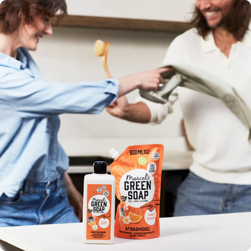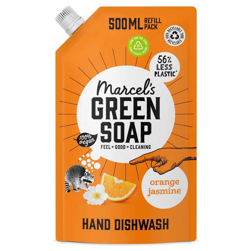 Marcel’s Green Soap jasmine and orange dishwashing detergent refill pack is at least 97% biodegradable. With this cost-effective refill, you save 56% plastic compared to a bottle.