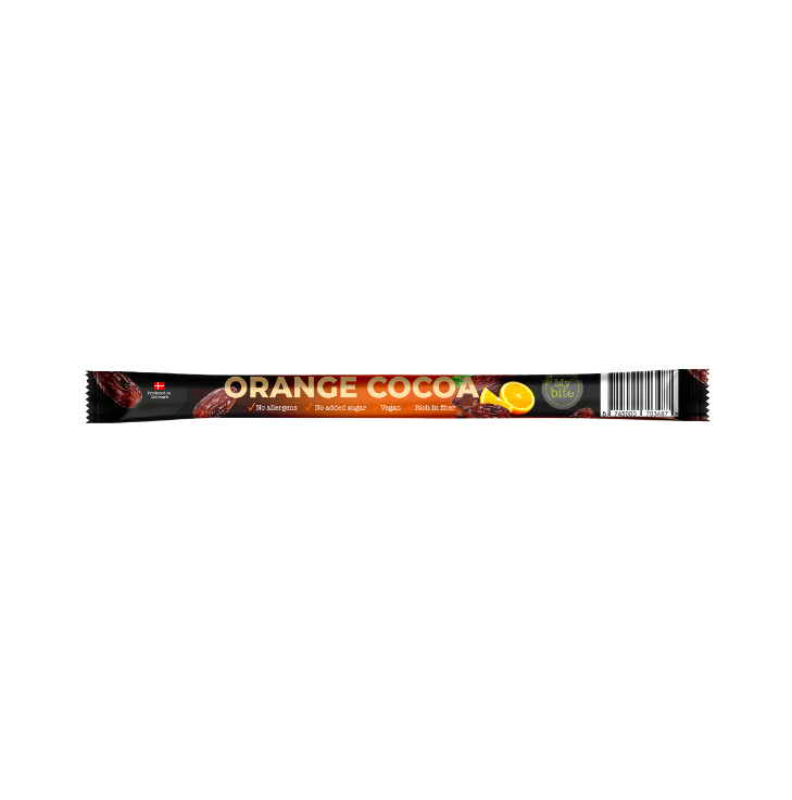 A vegan, gluten-free fruit bar with no added sugar, made from natural ingredients. The natural sweetness of dates combined with the richness of cocoa powder and the fresh citrus note of orange oil creates a delightfully chocolaty and vibrant taste experience. A healthy and energizing snack, perfect for a quick bite at any time.