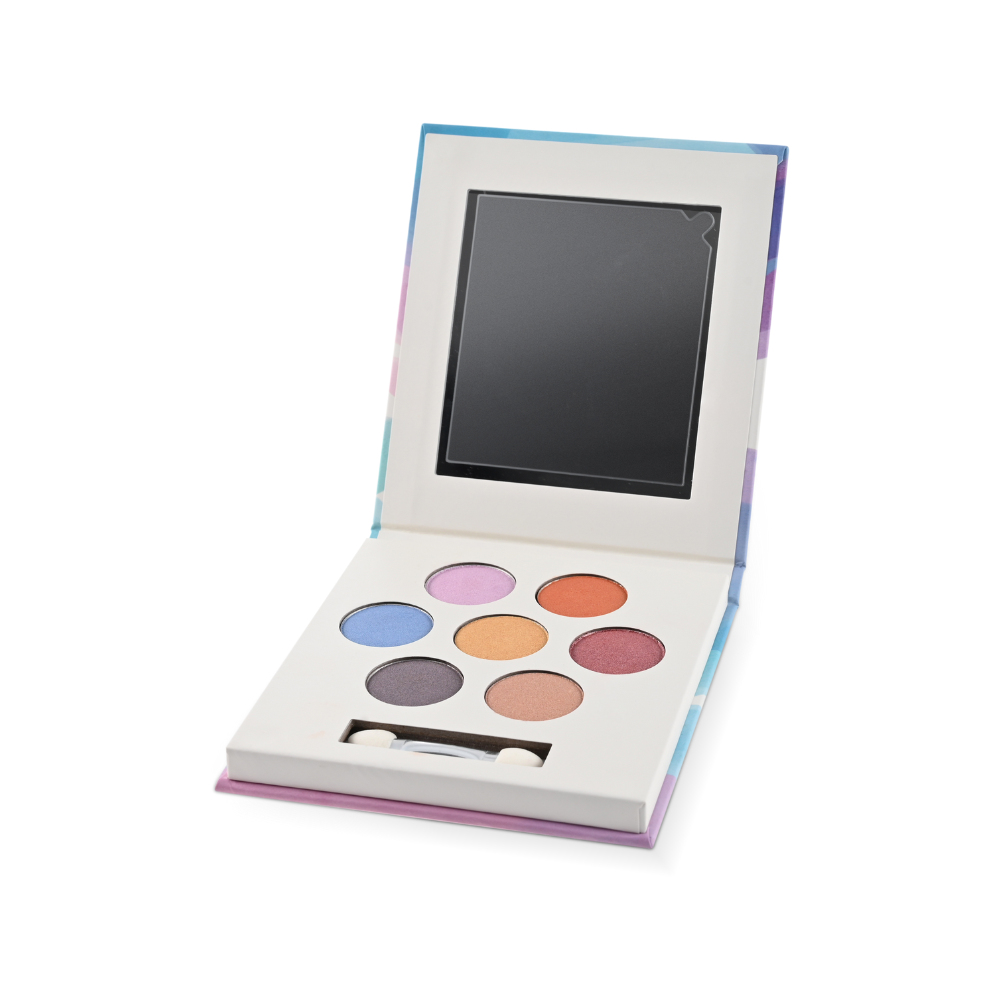 Palette containing a double-ended applicator, mirror, and 7 shimmering pearlescent eyeshadows.