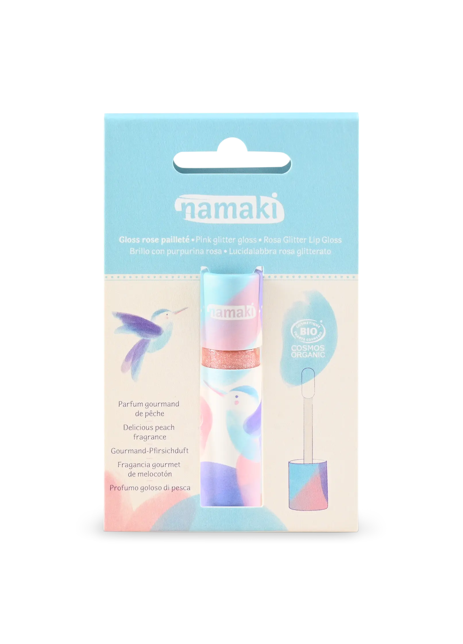 Lip gloss enriched with organic oils leaves lips soft and protected while giving them a delicate pink tint.