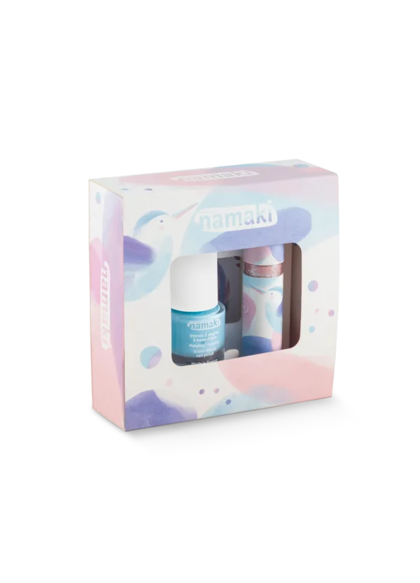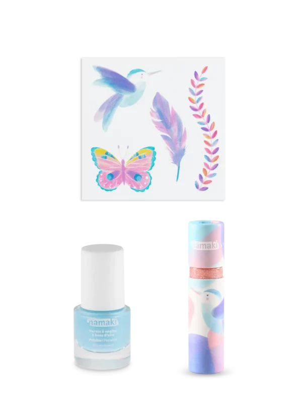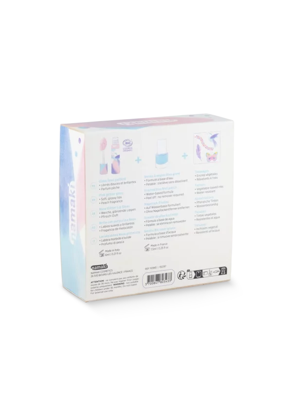 Three children’s favorites in one set: peach-flavored lip gloss, glittery blue nail polish, and an exclusive tattoo sheet – all with natural ingredients and a skin-friendly formulation suitable for sensitive skin.