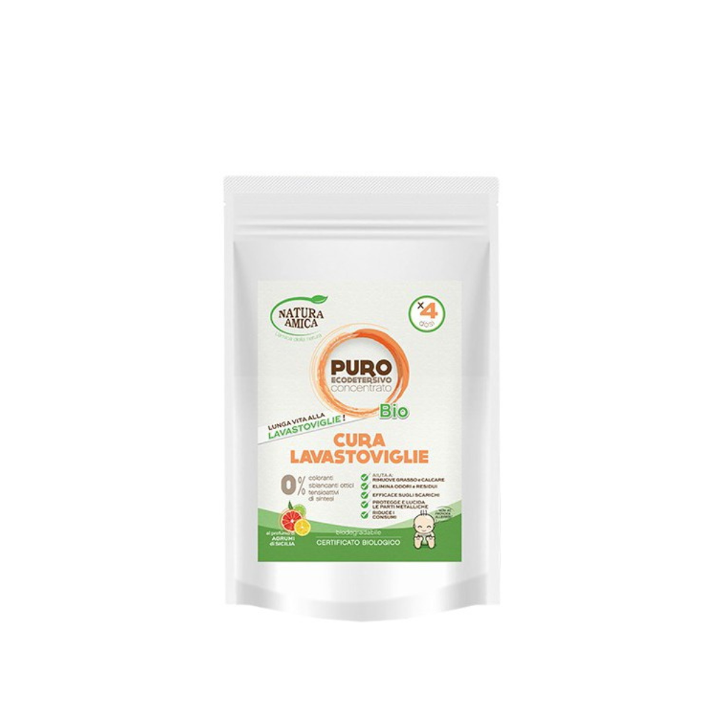 Natural concentrated powder for dishwasher maintenance free from harmful chemicals. Does not contain colorants, optical brighteners, or synthetic surfactants. Biodegradable. One package is sufficient for 4 uses.