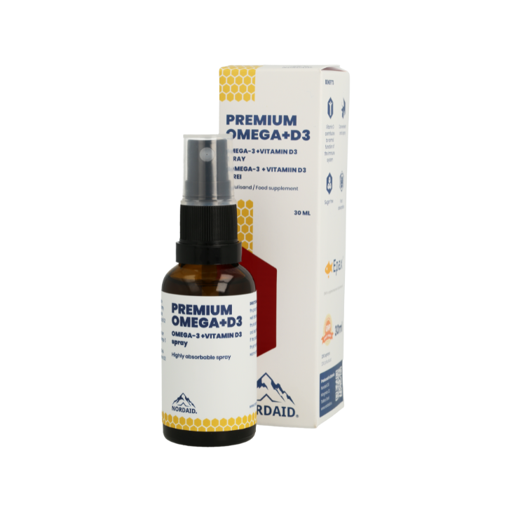 Adults: 5 sprays per day contain fish oil 585 mg, of which omega-3 fatty acids 337 mg, of which EPA (eicosapentaenoic acid) 168 mg and DHA (docosahexaenoic acid) 112 mg, vitamin D3 100 μg (4000 IU) (2000%*)