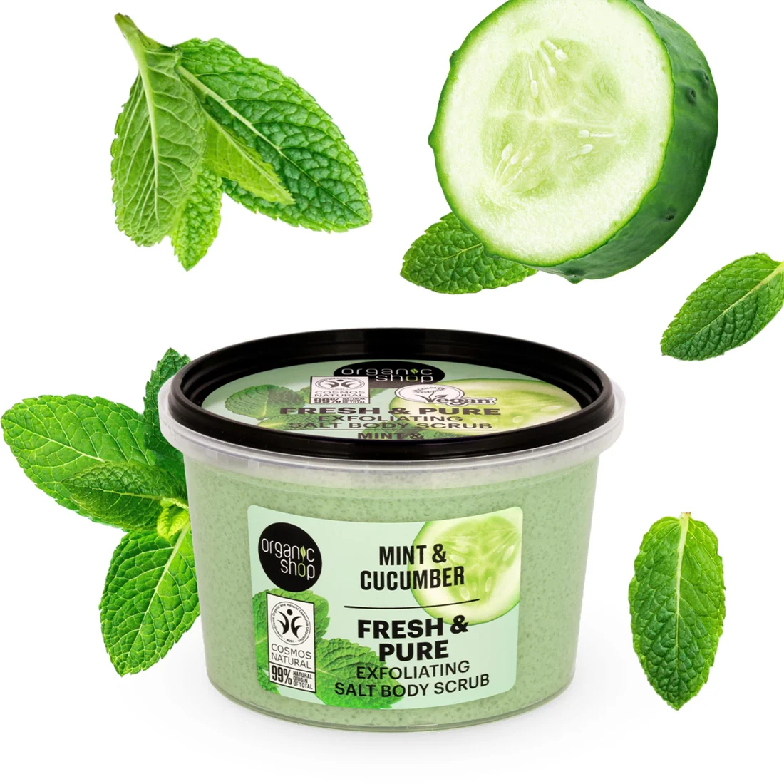 A body scrub enriched with organic peppermint and cucumber extracts offers the skin a refreshing, hydrating, and smoothing treatment.