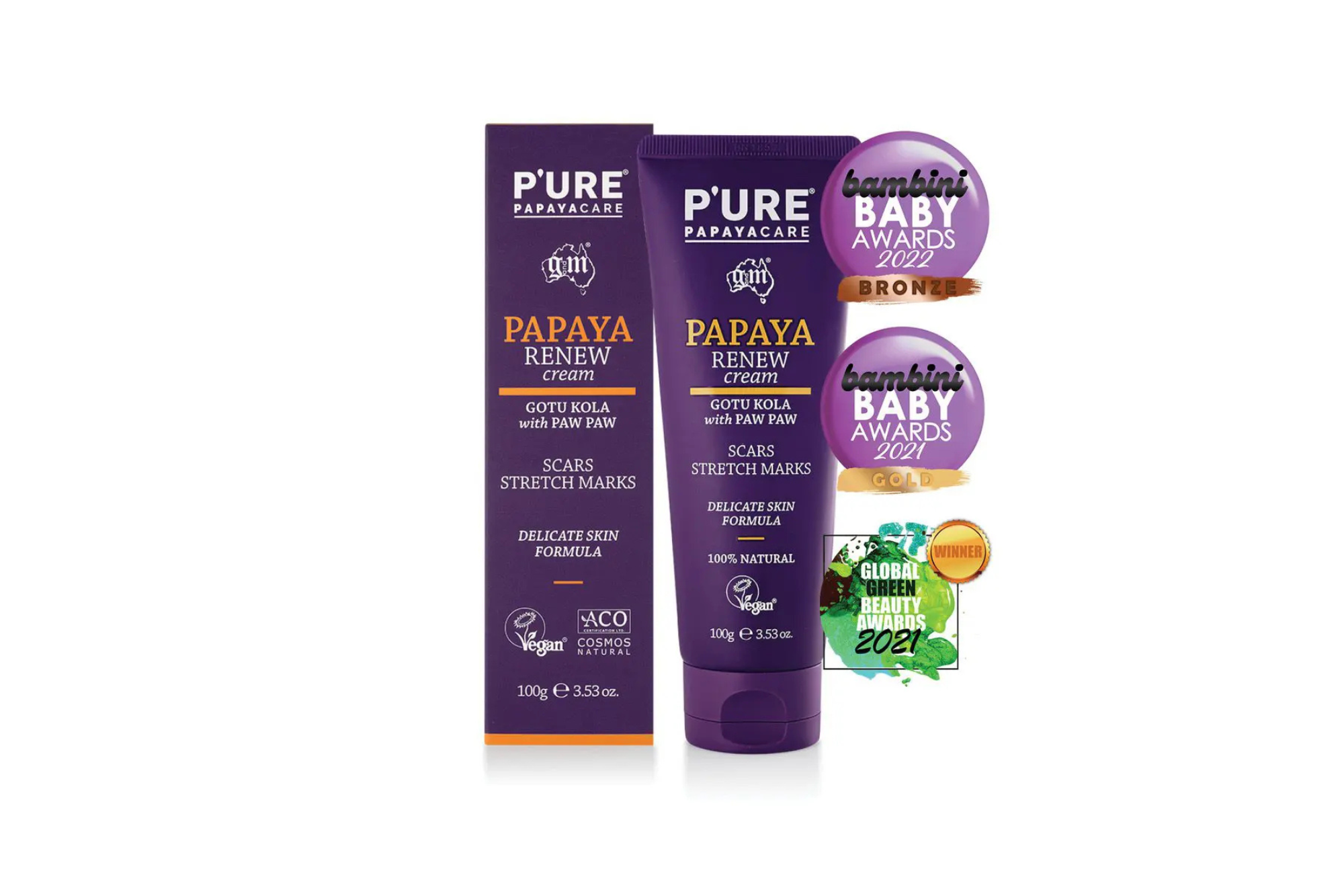 Use P’URE Papayacare Papaya Renew cream two to three times daily for at least one month to reduce the formation of scars and stretch marks. Patch test recommended.