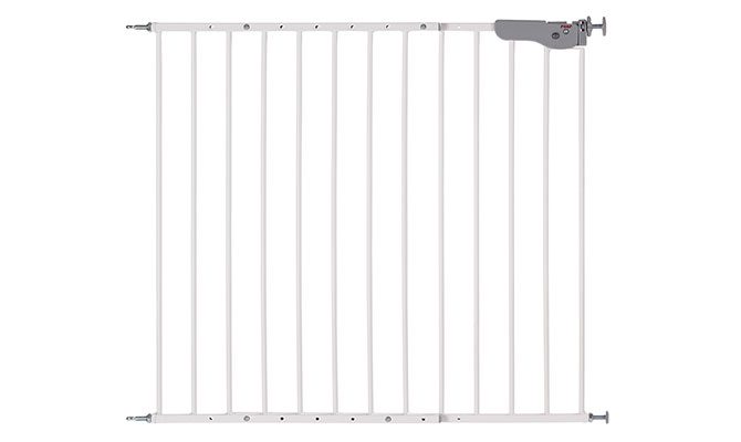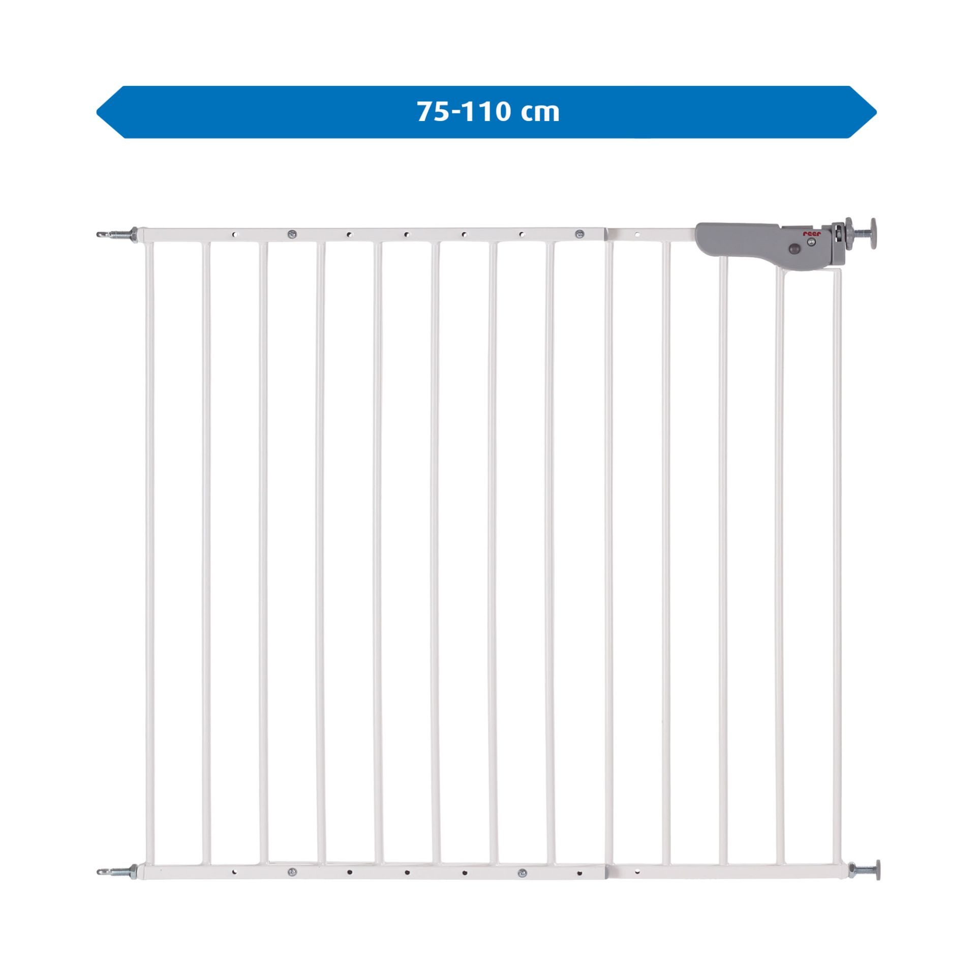 The width of the safety gate is continuously adjustable between 75–110 cm, allowing it to be adapted to openings of different widths without additional extensions. The gate is ideal for closing both the top and bottom of stairs, as well as wider doors or passageways. Thanks to the adjustable 4-point fixing system, the gate can be securely and stably installed even on uneven walls or moldings – each fixing point can be individually adjusted.