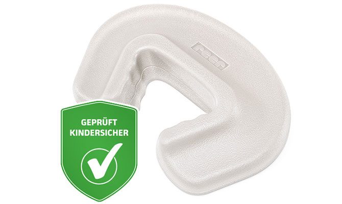 The stopper is made of durable and flexible plastic that is bite-resistant and maintains its shape during prolonged use. It is tested according to the European safety standard DIN EN 16654:2018, ensuring the product’s reliability even after long-term use. The stopper stays securely in place thanks to its non-slip material and special grooved surface structure, and installation requires no drilling, gluing, or use of screws.