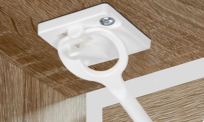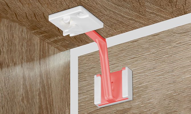With the innovative installation tool, attaching the lock is fast, simple, and precise – no measuring or marking needed. Just attach the installation components to the tool, remove the protective film, place it on the top of the cabinet, close the drawer, wait a moment, then swap the tool for the safety catch and fasten with screws – done!