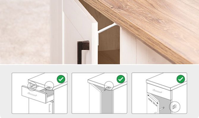 The double-locking mechanism keeps cabinets securely shut for children, but adults can easily open the lock with one hand – just press the lever down and slide to the right. The lock is installed inside the cabinet or drawer, remaining invisible from the outside and suiting any interior.