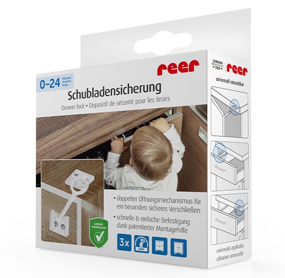 Cabinets and drawers are irresistibly intriguing for young children. As they learn to crawl and walk, they can easily access items that shouldn’t be in children’s hands – such as sharp tools or hazardous cleaning agents. The Reer child safety lock helps keep dangerous items safely hidden, providing quick, easy, and reliable protection.