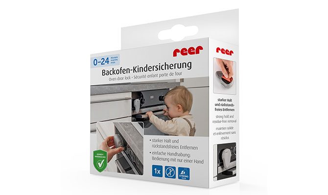 When children start crawling and walking, the oven door becomes an inviting place to explore – a low handle, tempting smells, and a glowing light attract them. The REER oven child safety lock helps prevent your child from quietly opening the oven door, protecting them from dangerous burns and falling hot items.