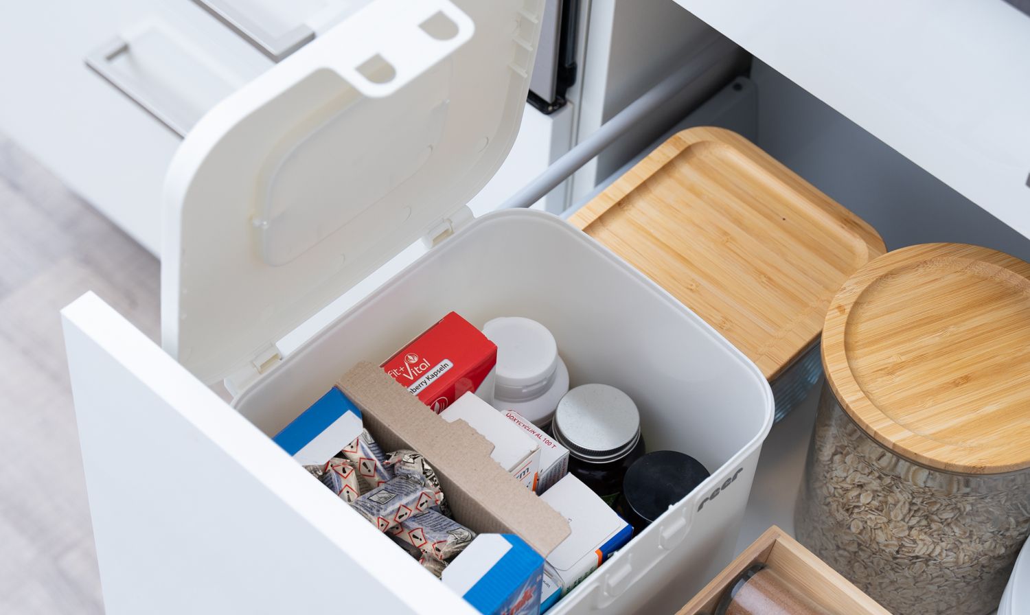 The storage box safely stores washing machine and dishwasher tablets, batteries, medicines, and other small hazardous items that a child could accidentally swallow. This way, potentially dangerous items stay in a secure and organized place.
