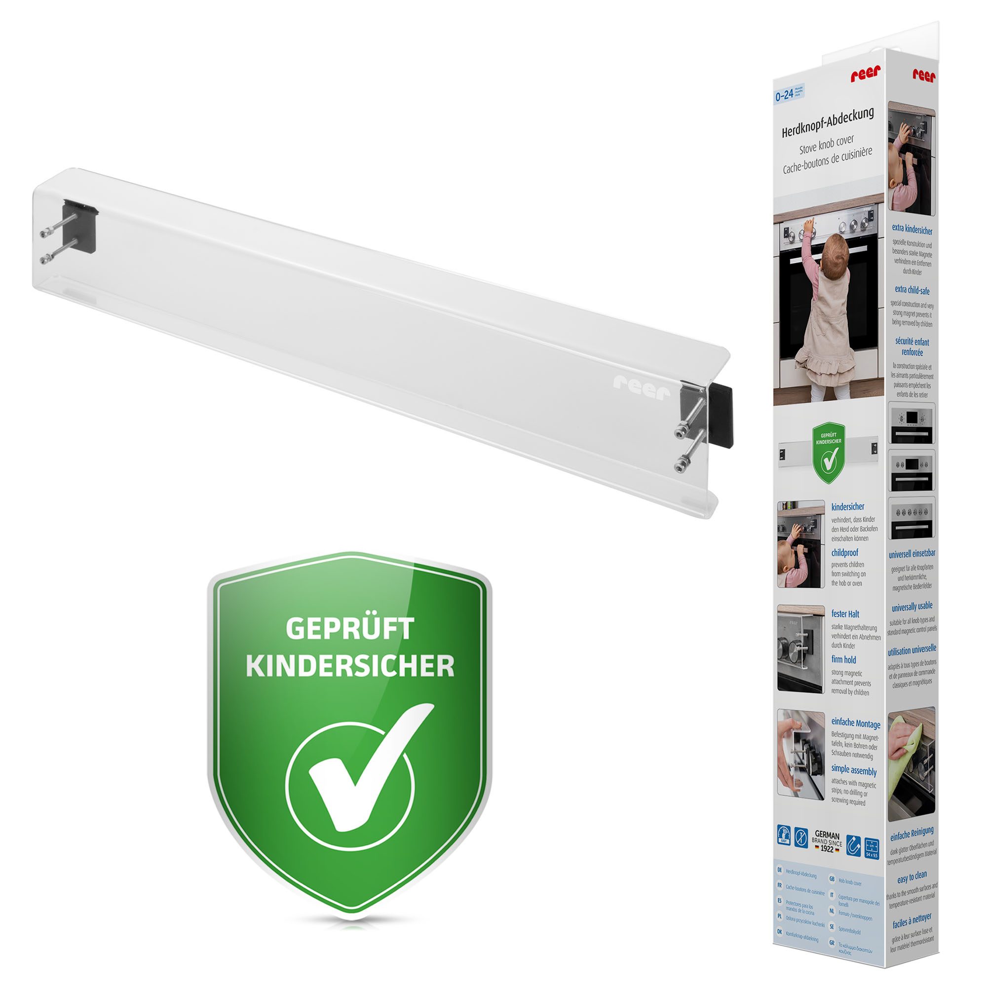 Thanks to its size (54 cm x 9.5 cm x 2.9 cm), this guard fits most standard stoves and ovens with magnetic control panels, whether the knobs are protruding or recessed. Only a 3 mm gap between the countertop and control panel is needed. Transparent acrylic glass blends seamlessly with any kitchen style without drawing attention to the hazardous area.