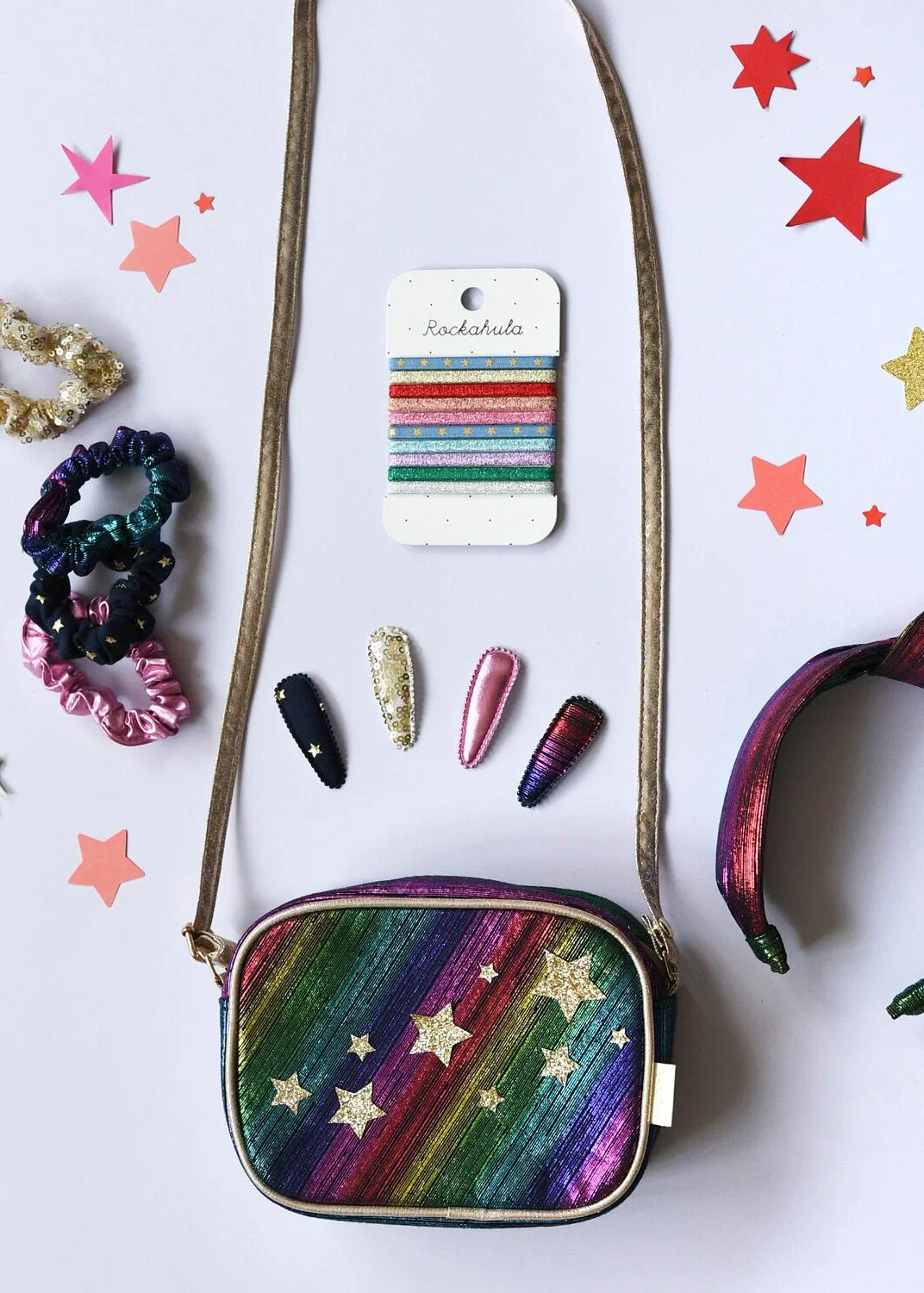 Dance your way into disco rhythms with the Disco Fever bag! The bag is made of soft fabric, adorned with foil print in rainbow hues and sparkling gold stars. Inside is starry lining, the bag has a zip closure and adjustable crossbody strap with a breakaway point for safety. Perfect spot to hide all your disco essentials!