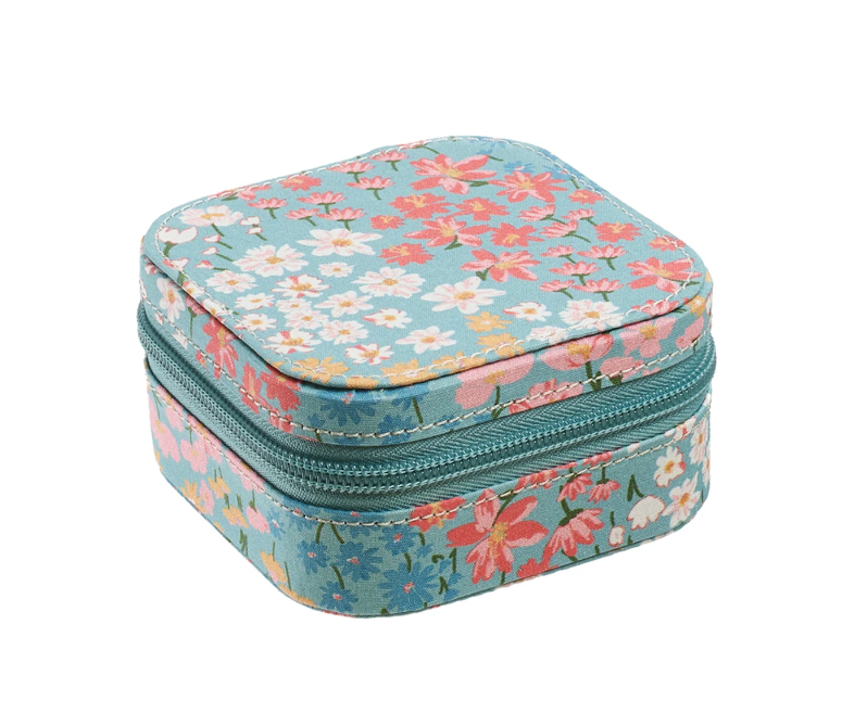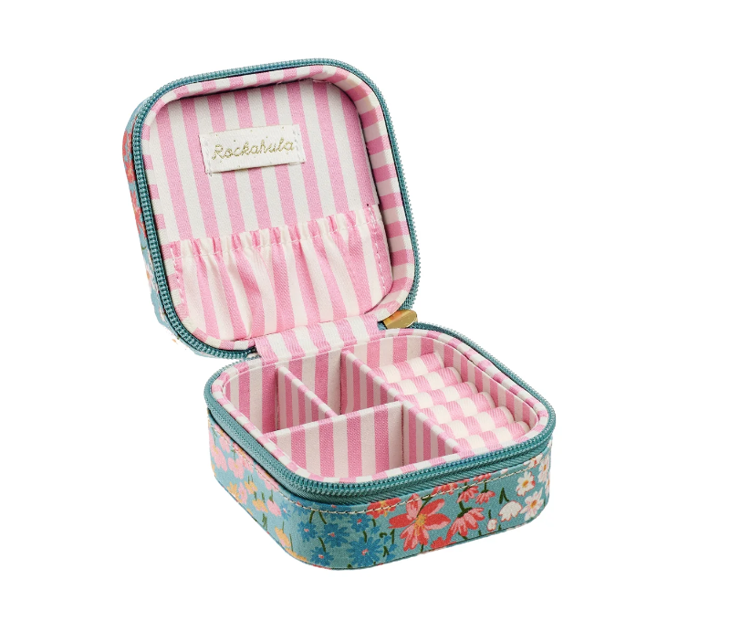 The magical velvet jewelry box is the perfect place to keep all your Rockahula jewels and favorite treasures safe! Covered with Heidi floral fabric. The jewelry box opens to reveal three sections, a pocket, and a separate space for earrings and rings. Lined with candy stripe pink fabric.