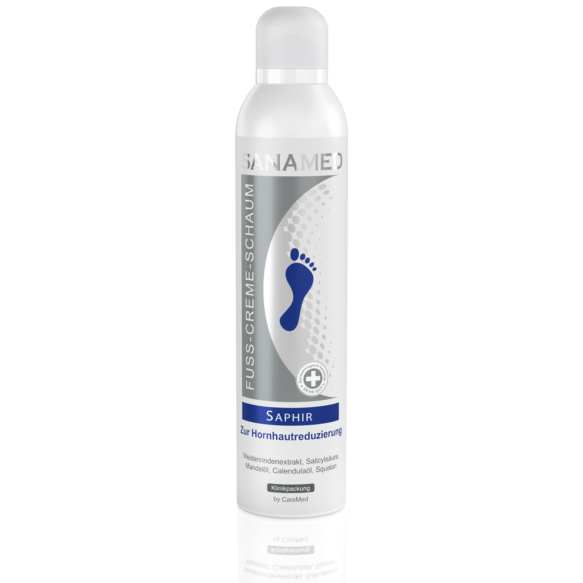 SANAMED Saphir foot foam cream is a fast-absorbing foam cream. Contains 10% urea, glycerin, willow bark extract, and salicylic acid. This lightweight creamy foam intensely cares for and moisturizes the skin and slows the formation of new keratinized skin. Does not contain PEG, fragrance, or colorants.