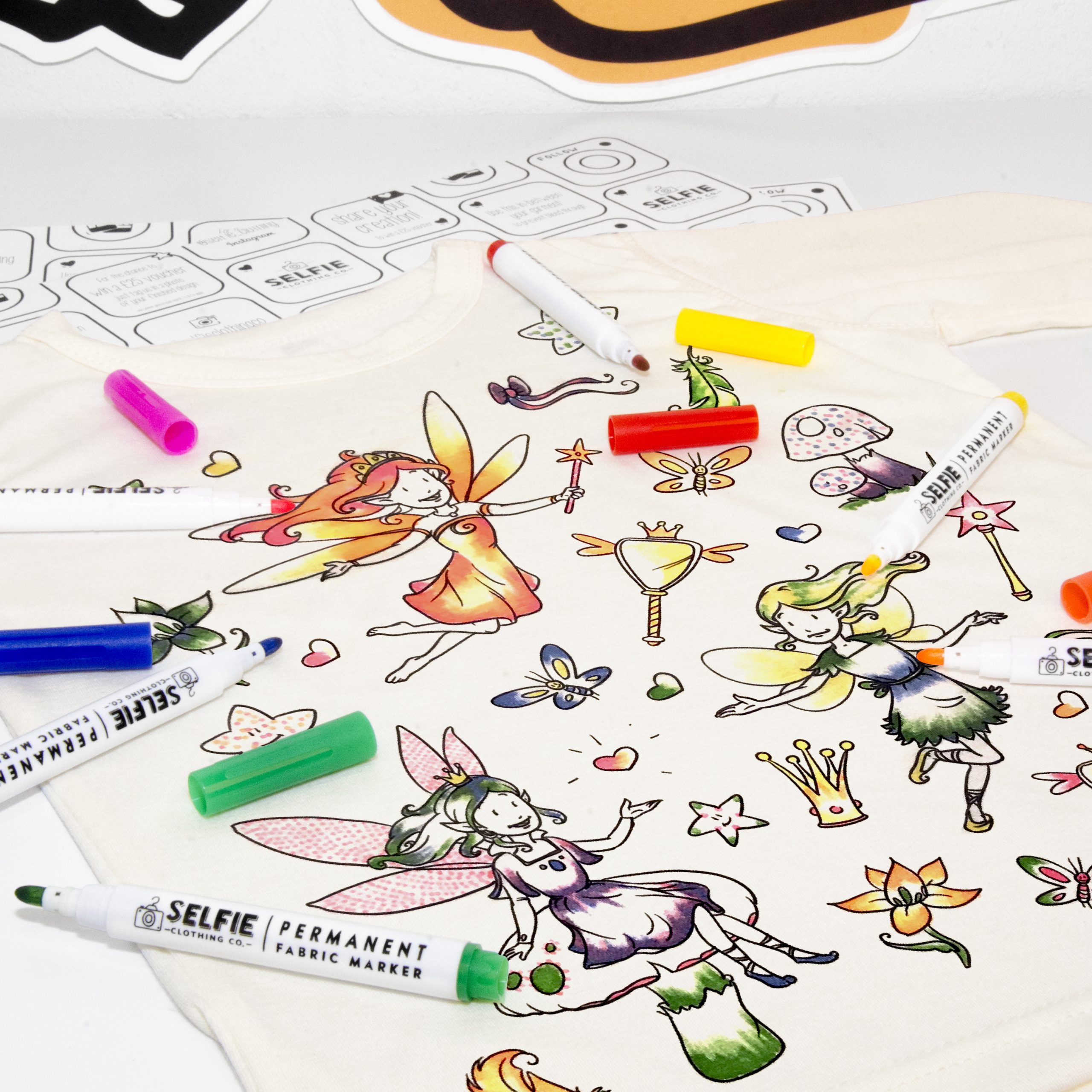 The shirt is made from lightweight and comfortable jersey fabric and is suitable for ages 3–12 years. The markers are with UV ink, which stays bright even after multiple washes. The color can be set by letting it air dry for 24 hours or by ironing the marker-covered areas (under adult supervision). The shirts are designed and hand-printed in the UK, specifically for Selfie Craft Co. An ideal gift for a creative child or a fun activity at birthdays and playdates.