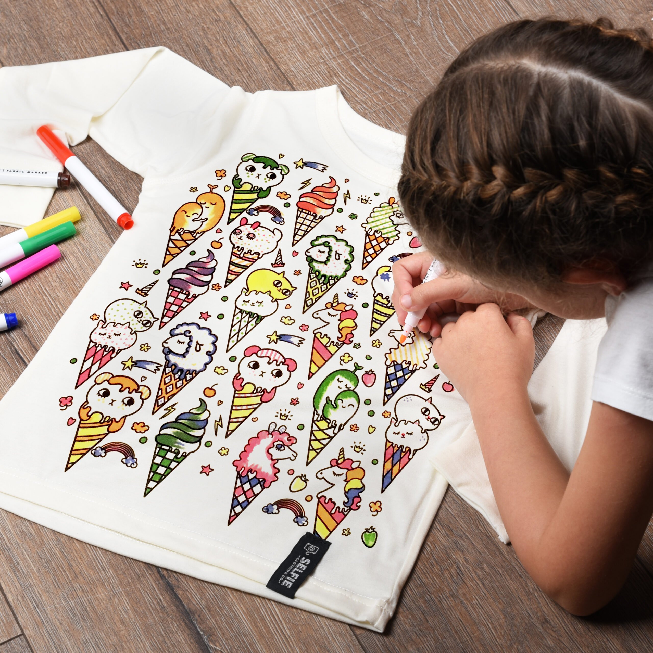 The lightweight jersey blend top features a unique icekream kitty colour in design, ready for your little ones to get creative with. The fabric pens use high-quality UV ink which can be air cured for 24 hours or ironed by a parent. The colours will not fade and can be worn time and time again.