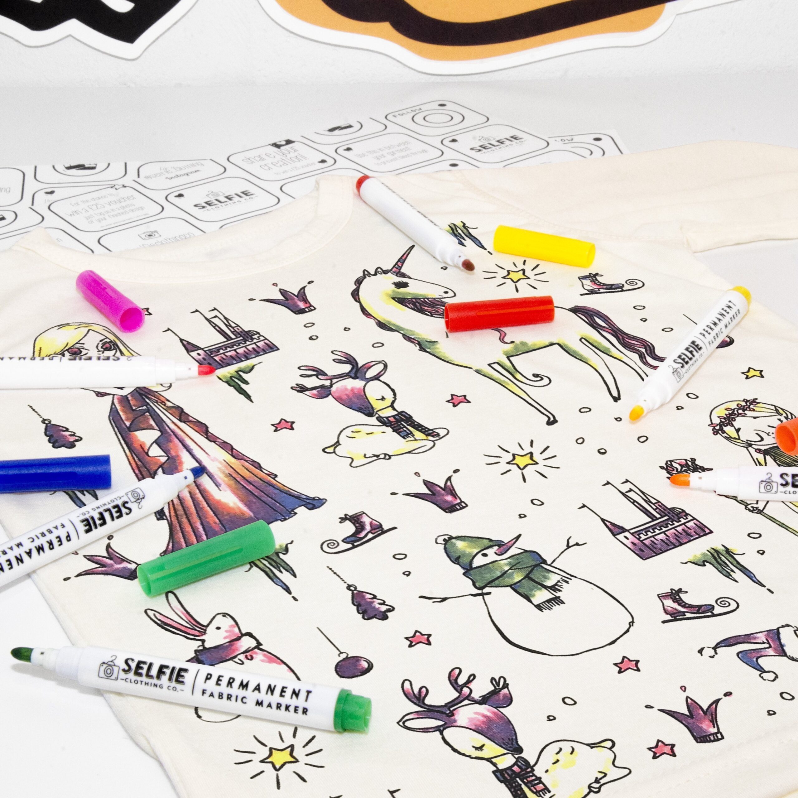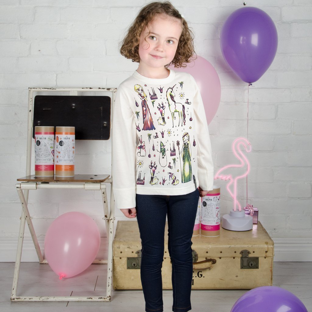 This beautifully packaged children’s colour in, creative kit includes; a long-sleeved round neck top, six fabric colour in pens and a colour in practice sheet available for ages 3-12.