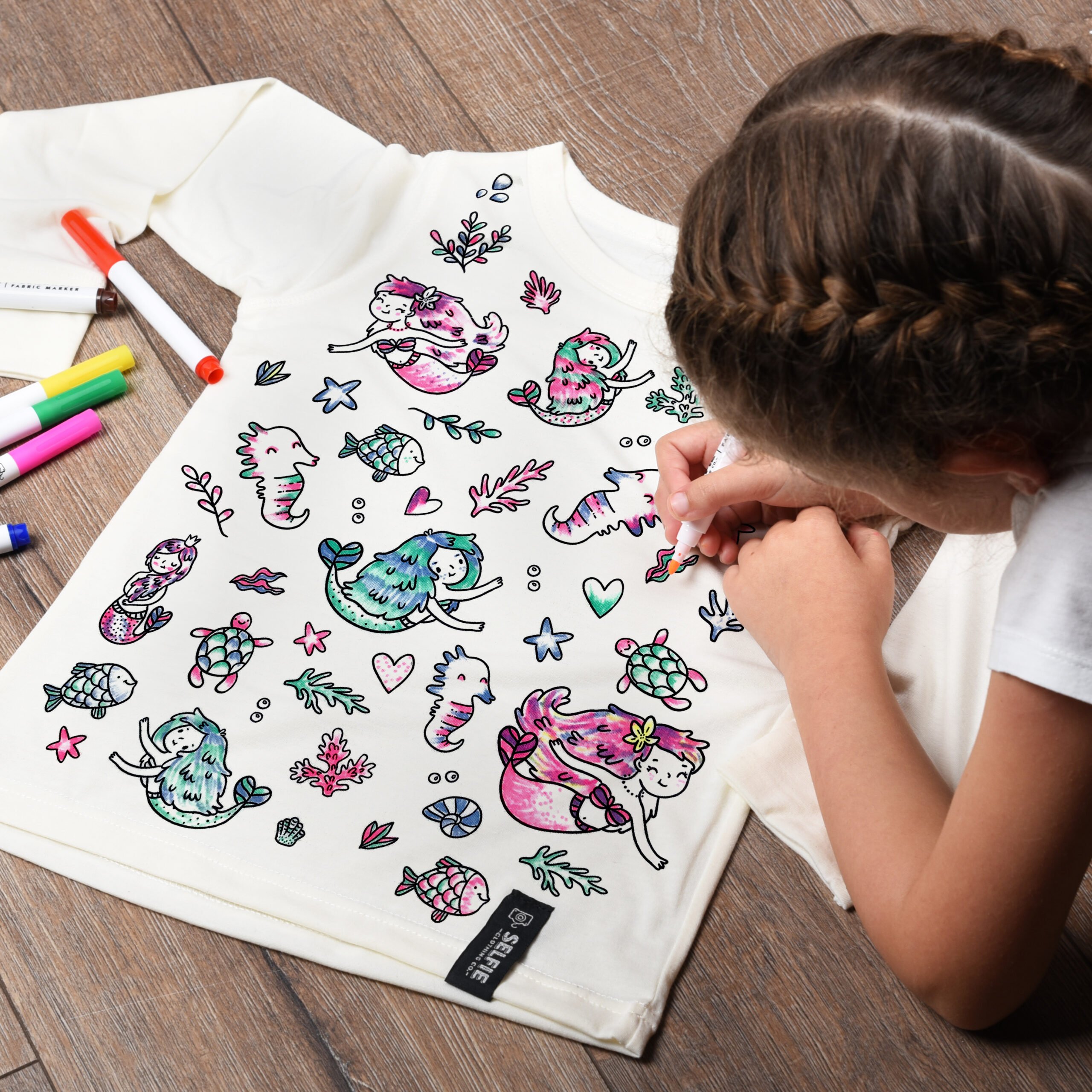 The kit includes; a long-sleeved round neck top, six fabric colour in pens and a colour in practice sheet available for ages 3-12.