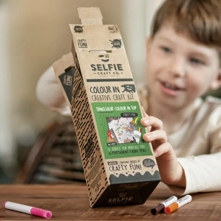 Made from a light and comfortable jersey blend, the top features a unique dinosaur design ready to be coloured in. The included fabric pens contain high-quality UV ink, which sets naturally within 24 hours or can be fixed by ironing (by an adult). Once set, the colours won’t fade, making the top suitable for repeated wearing and washing.