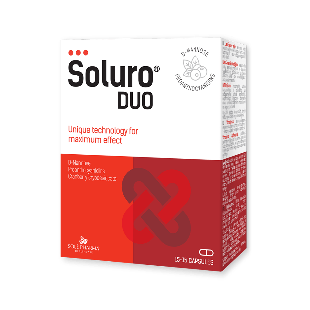 The unique combination of cranberry concentrated proanthocyanidins (PAC) and D-mannose contained in Soluro Duo capsules effectively blocks all adhesion appendages of bacteria causing cystitis. This prevents pathogenic bacteria from adhering to the bladder mucosa and penetrating the cells, thus preventing the development of cystitis.