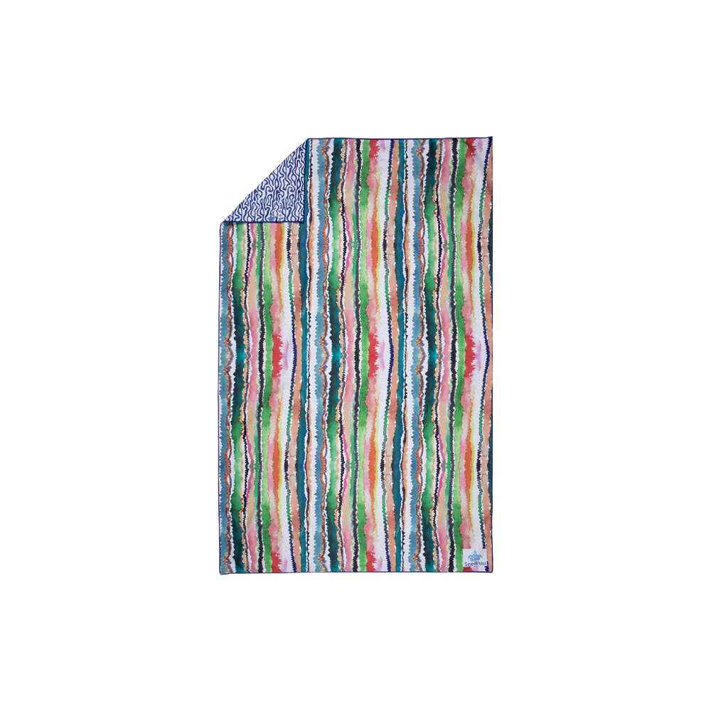 The fast-drying handsome beach towel features a double-sided print. Each Shoresyde towel uses up to 20 plastic bottles collected from the ocean or land.