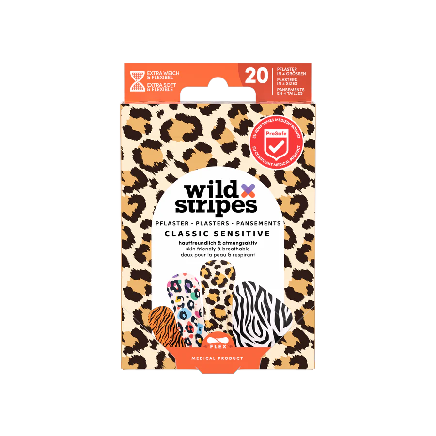Wild Stripes Classic Sensitive Animal is an EU-compliant medical product that offers more than just protection. The dressings with fun patterns and pastel colors bring positivity to every day while providing reliable protection for minor wounds. The set is ideal for people with sensitive skin—dressings are skin-friendly, hypoallergenic, and offer super strong adhesion even with an active lifestyle.