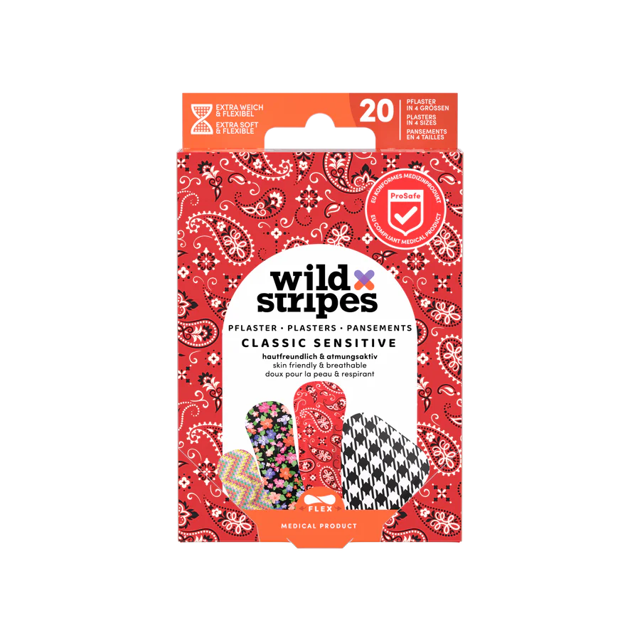 Wild Stripes Classic Sensitive fashion is an EU-compliant medical product that offers more than just protection. These fun-patterned and pastel-colored patches bring positivity to each day while offering reliable protection for minor wounds. The set is ideal for people with sensitive skin – the patches are skin-friendly, hypoallergenic, and offer super strong adhesion even with an active lifestyle.